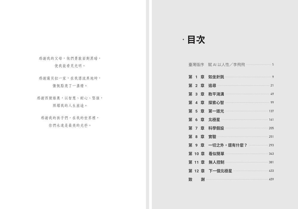 這本令人驚嘆的書出自人工智能領域頂尖科學家手筆。讀者不僅能看到一名年輕科學家動人的個人成長故事,也能走進這個時代最重要的科學,一窺它的早期發展。本書所講的故事富有深刻的人性,其根源在於李飛飛一生對學習的熱情和對科學的熱愛。——艾德.卡特莫爾(Ed Catmull),皮克斯共同創辦人、《創意電力公司》作者