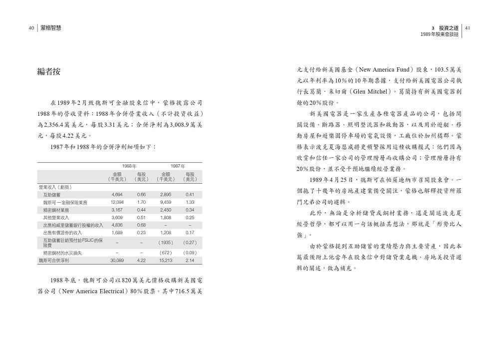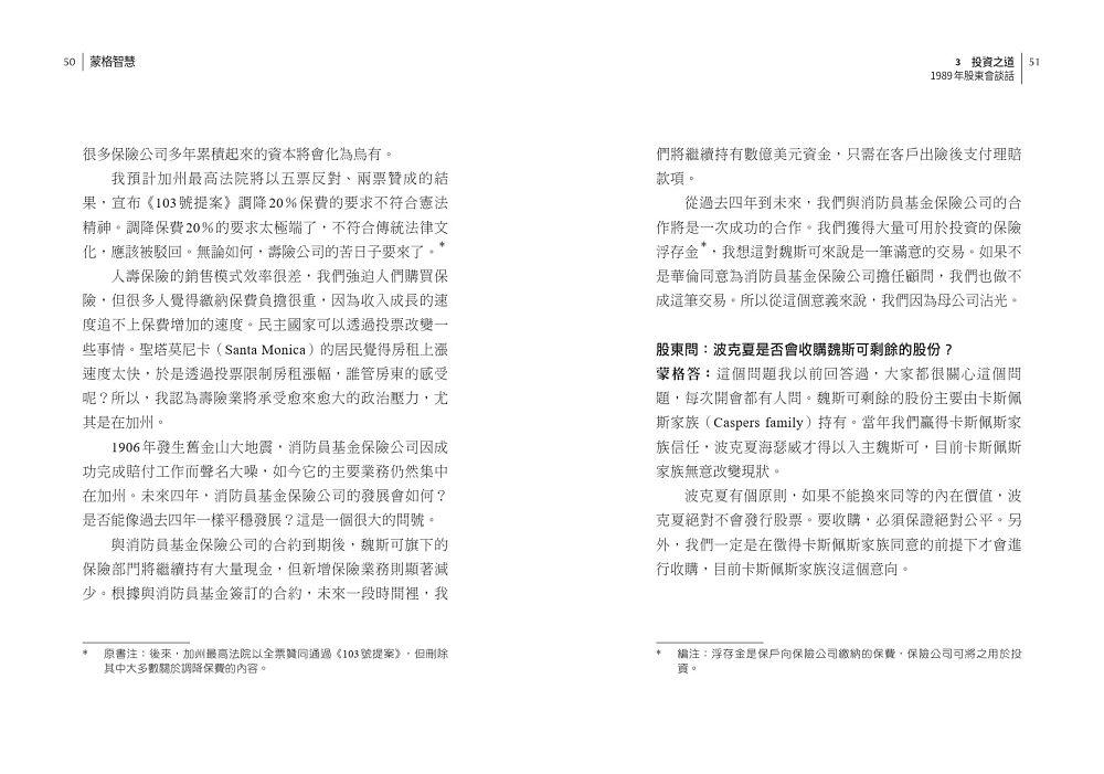 實際上,蒙格從1987年至2010年擔任魏斯可金融公司董事長期間,幾乎每年都在股東會上公開談話,並接受股東的提問。他會先介紹公司的經營情況,闡述當年魏斯可公司與波克夏的投資策略。並經由股東的提問,分享他對產業的觀察與總體經濟趨勢。