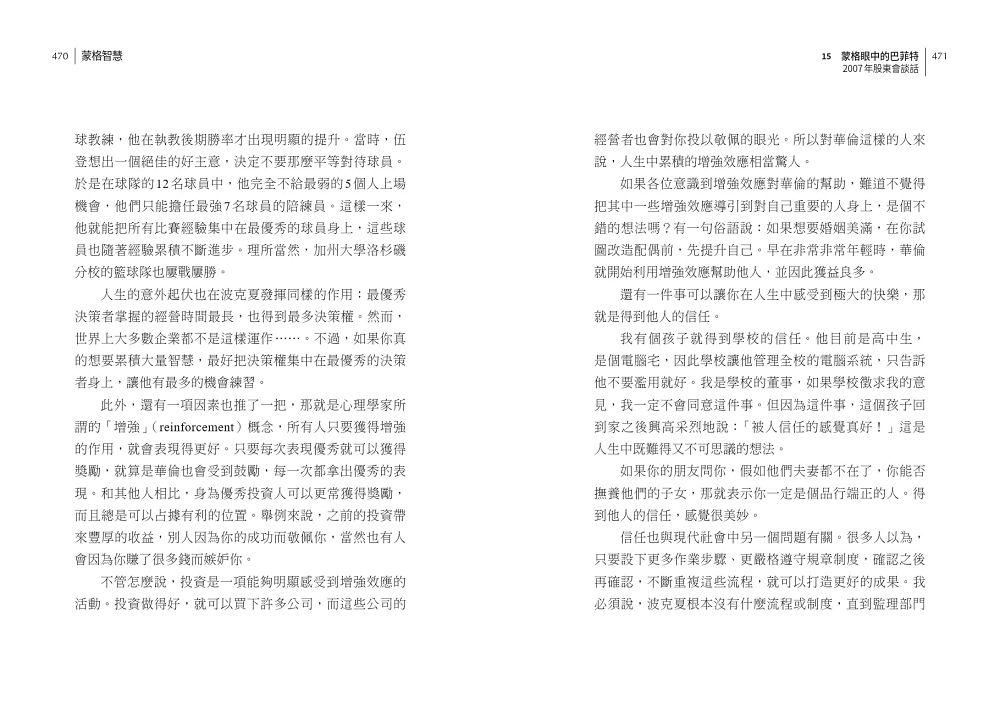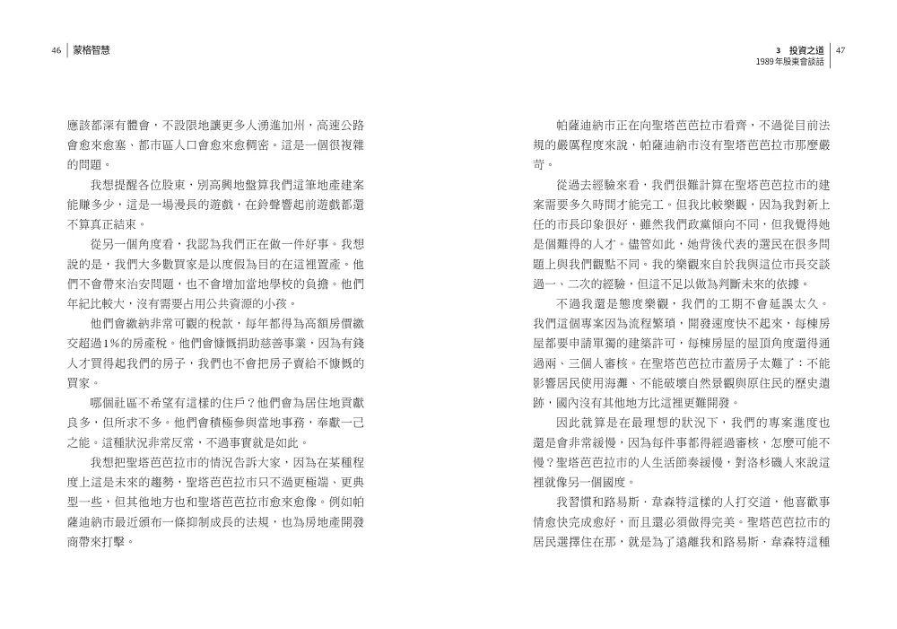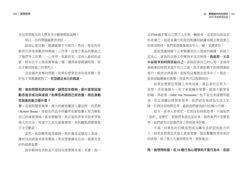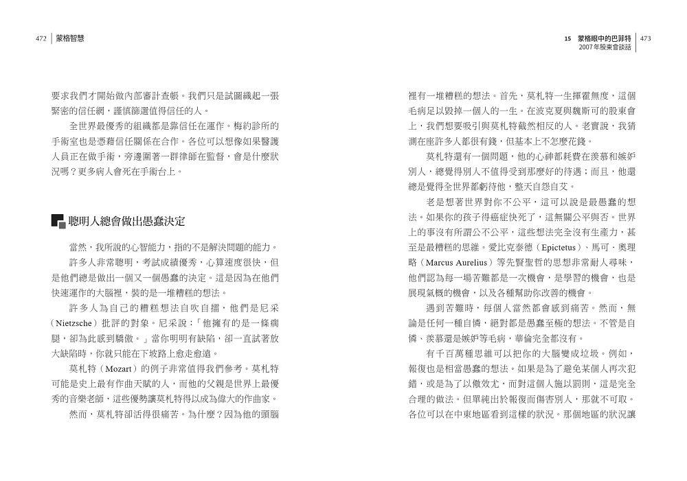 本書收錄蒙格在魏斯可公司股東會上的談話與問答,讓讀者得以近距離觀摩這位當代最優秀投資人的思維模式,你可以看到: