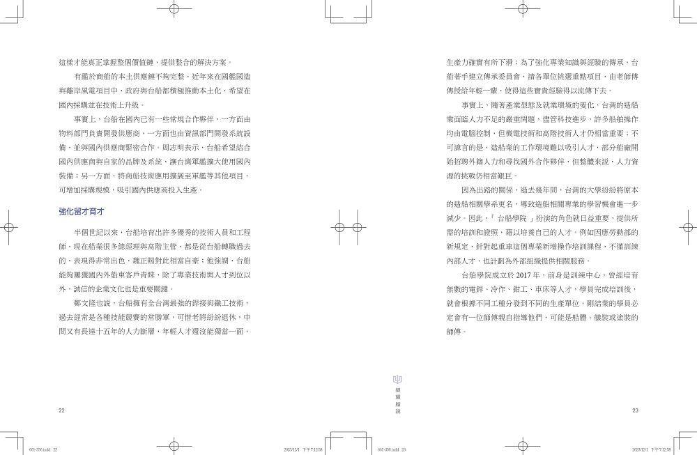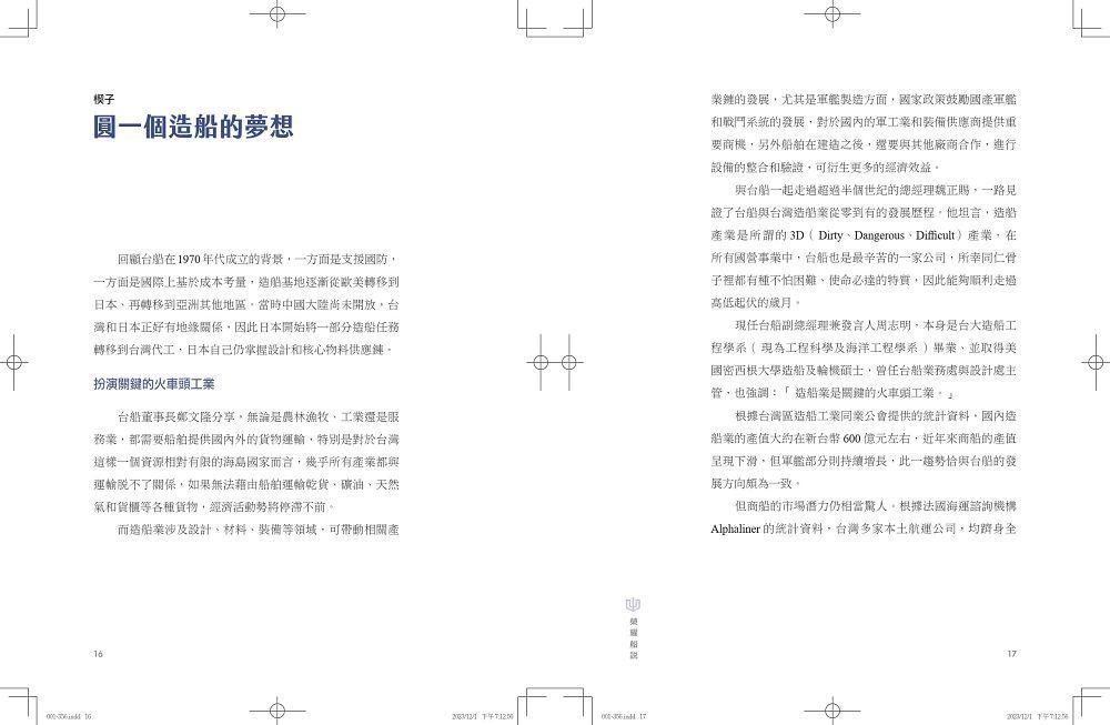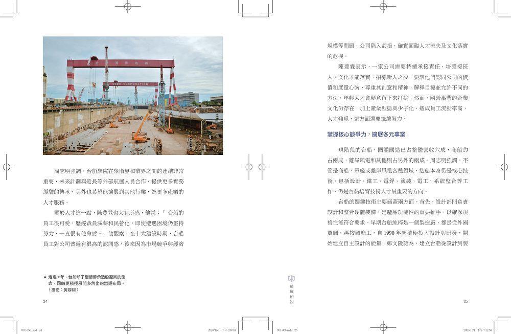 台灣是海洋國家,位處西太平洋第一島鏈戰略樞紐位置,海岸線綿長,海洋資源維護利用與海疆領域的防衛安全攸關國家生存發展。台船公司走過50年,歷經轉型成長,在台灣的造船技術發展、國防工業自主及海洋綠能開發都扮演關鍵角色。