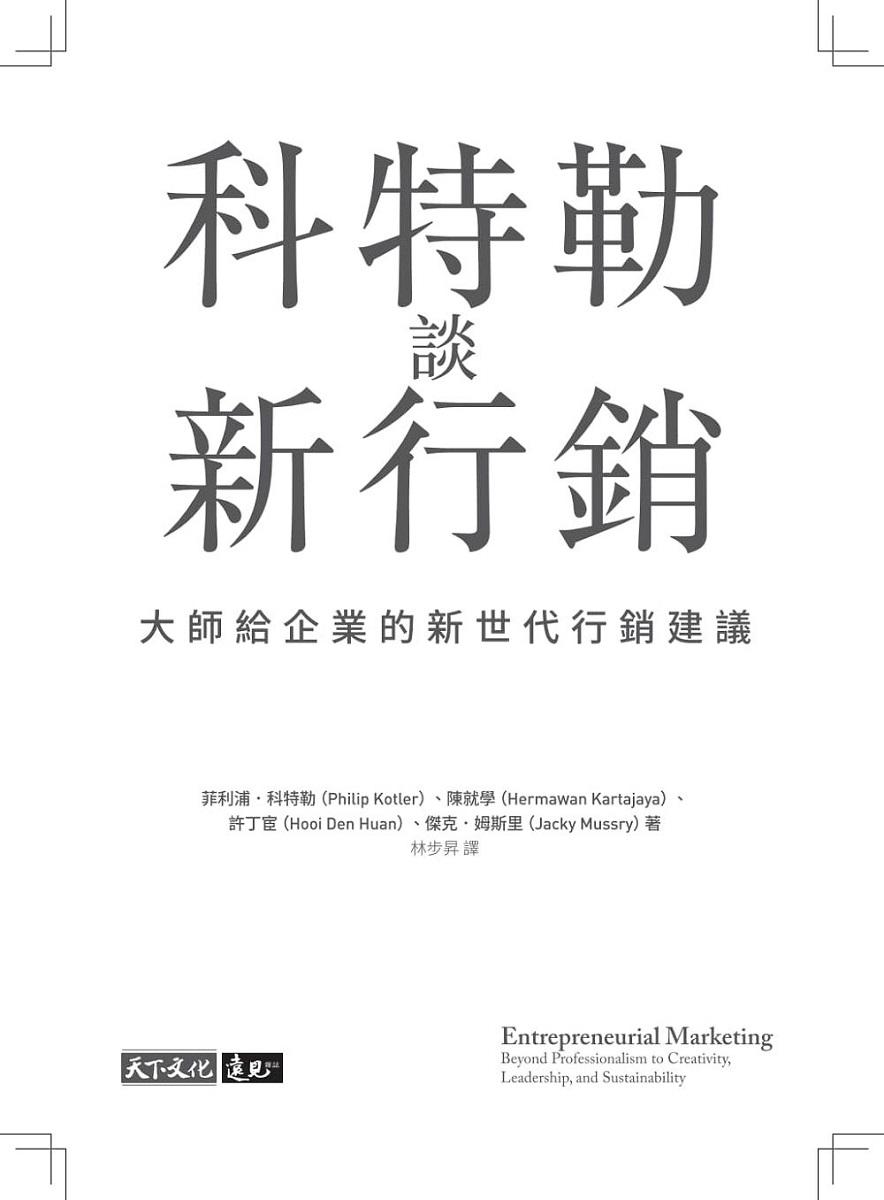 在現今世界中,傳統上廣受接納的行銷「真理」正受到重重考驗,凡是想開發自己的品牌或塑造可長可久永續的企業,《科特勒談新行銷》是必讀之作,尤其適合行銷專業人士、高階主管、創辦人、經理人,和希望一窺未來行銷策略的讀者,本書將一步步引領大家邁向2030年以後的世界。