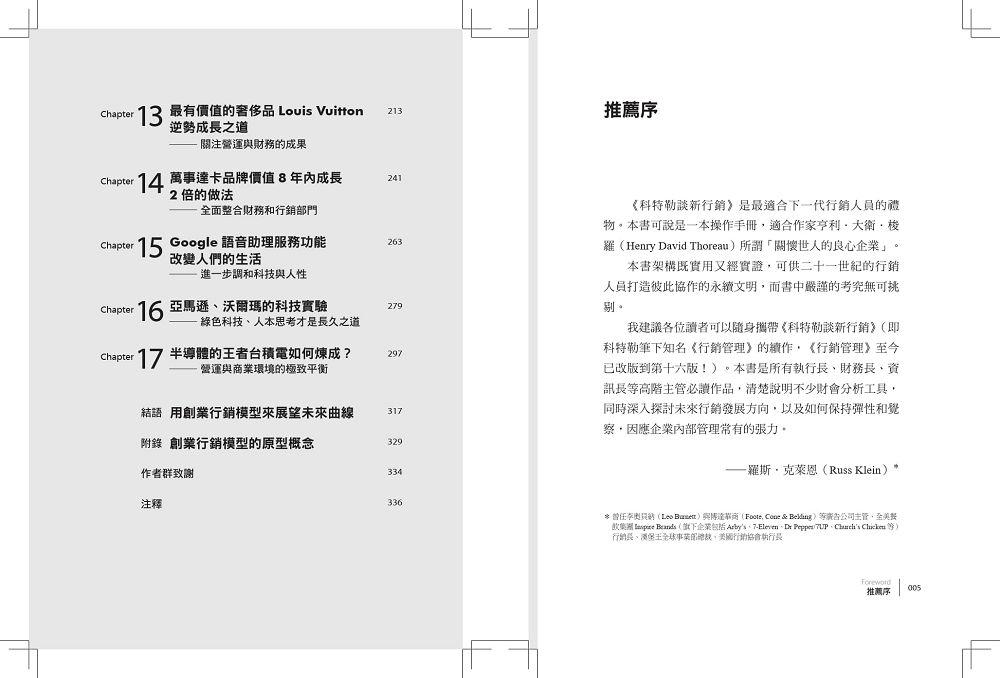 「我很欣賞這本書的基本理念,即運用創業思維和工具來強化既有專業素養,而不是單純取而代之。這本書說明了創業思維如何透過創意、敏捷和樂觀進取的態度,拓展現代企業的專業素養,以應對當前充滿變動的行銷環境。」 ——大衛.艾克(David Aaker),加洲大學柏克萊分校哈斯商學院名譽教授