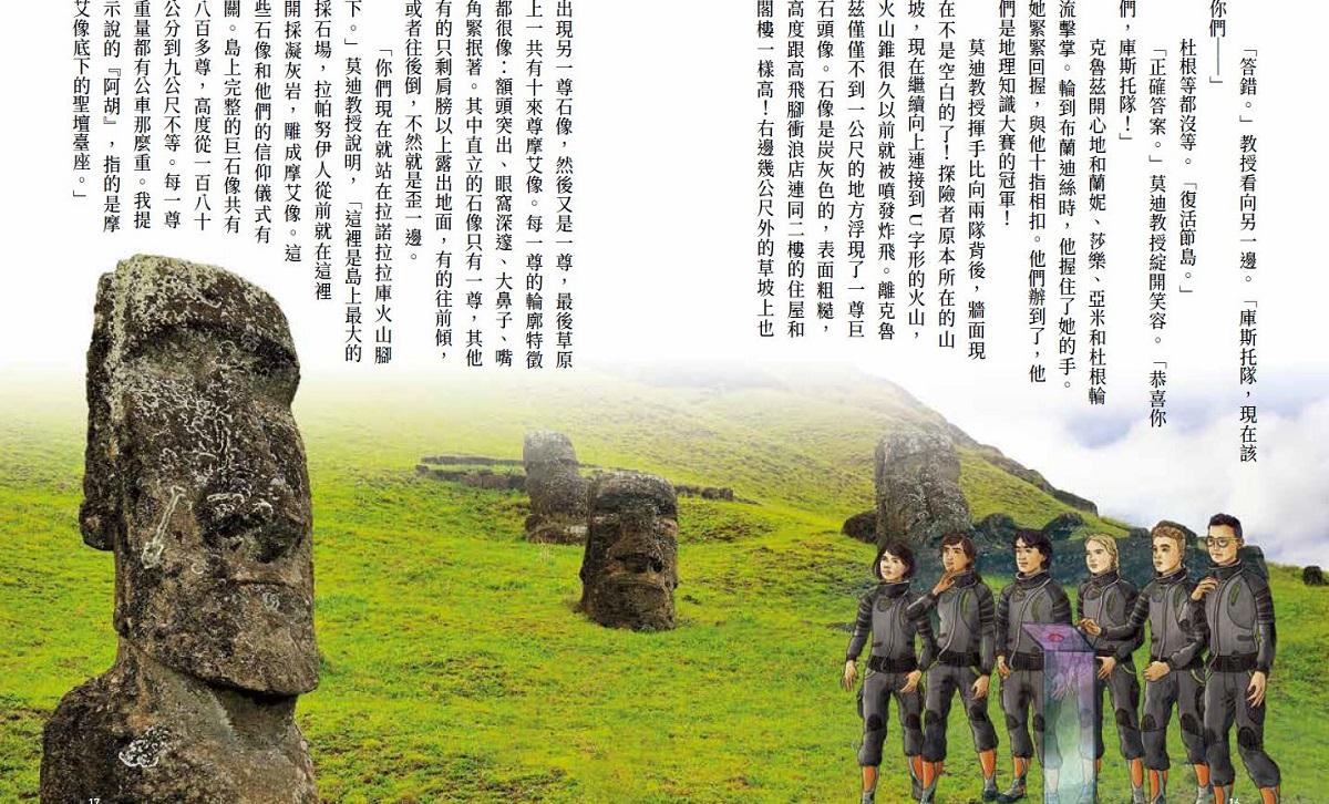 莫迪教授揮手比向兩隊背後,牆面現在不是空白的了!探險者原本所在的山坡,現在繼續向上連接到U字形的火山,火山錐很久以前就被噴發炸飛。離克魯茲僅僅不到一公尺的地方浮現了一尊巨石頭像。石像是炭灰色的,表面粗糙,高度跟高飛腳衝浪店連同二樓的住屋和閣樓一樣高!右邊幾公尺外的草坡上也出現另一尊石像,然後又是一尊,最後草原上一共有十來尊摩艾像。每一尊的輪廓特徵都很像:額頭突出、眼窩深邃、大鼻子、嘴角緊抿著。其中直立的石像只有一尊,其他有的只剩肩膀以上露出地面,有的往前傾,或者往後倒,不然就是歪一邊。