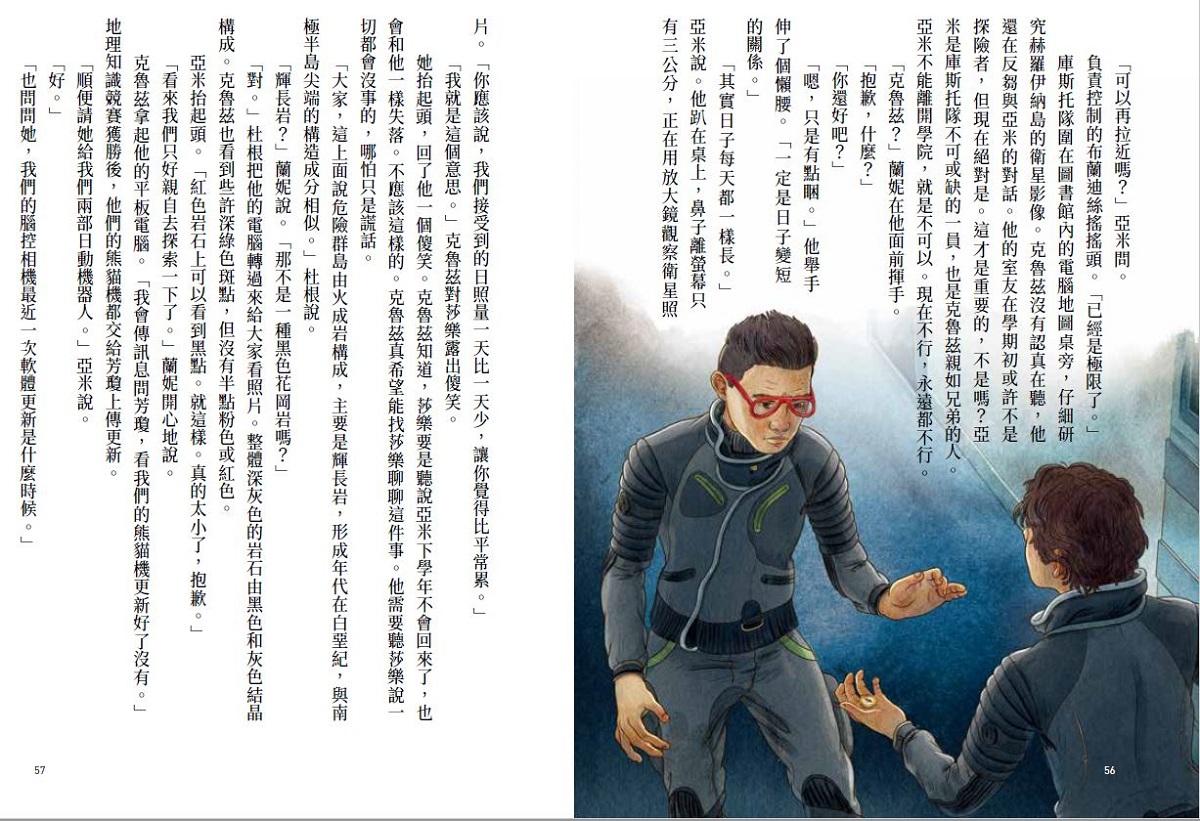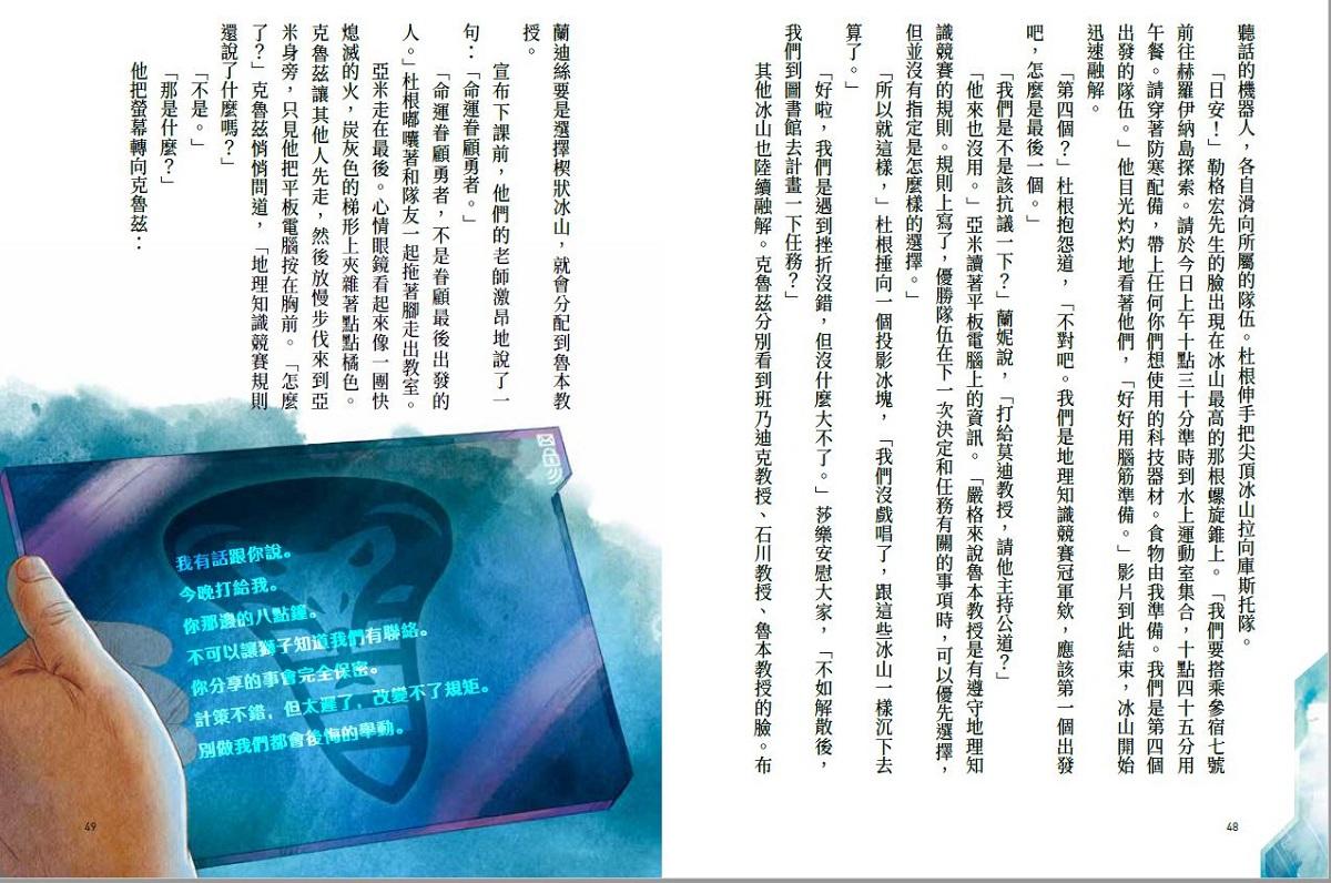 看來真的很有希望。阿里、詹恩、卡特、馬提歐、尤莉雅和孫濤圍成一圈竊竊私語。剛才將近一個小時裡,四支探險者隊伍在獵戶座號的洞穴裡力拼高下。克魯茲累得半死,他看得出隊友也是。蘭妮的臉頰紅通通的滿是汗水,莎樂的馬尾掉了一綹出來,亞米的心情眼鏡像兩個大熱天在車上放太久的巧克力甜甜圈。杜根左搖右擺坐立不安,像個準備阻擋罰球的守門員,只差他們比的不是足球,而是緊張刺激又燒腦、拚得你死我活的地理知識問答賽。