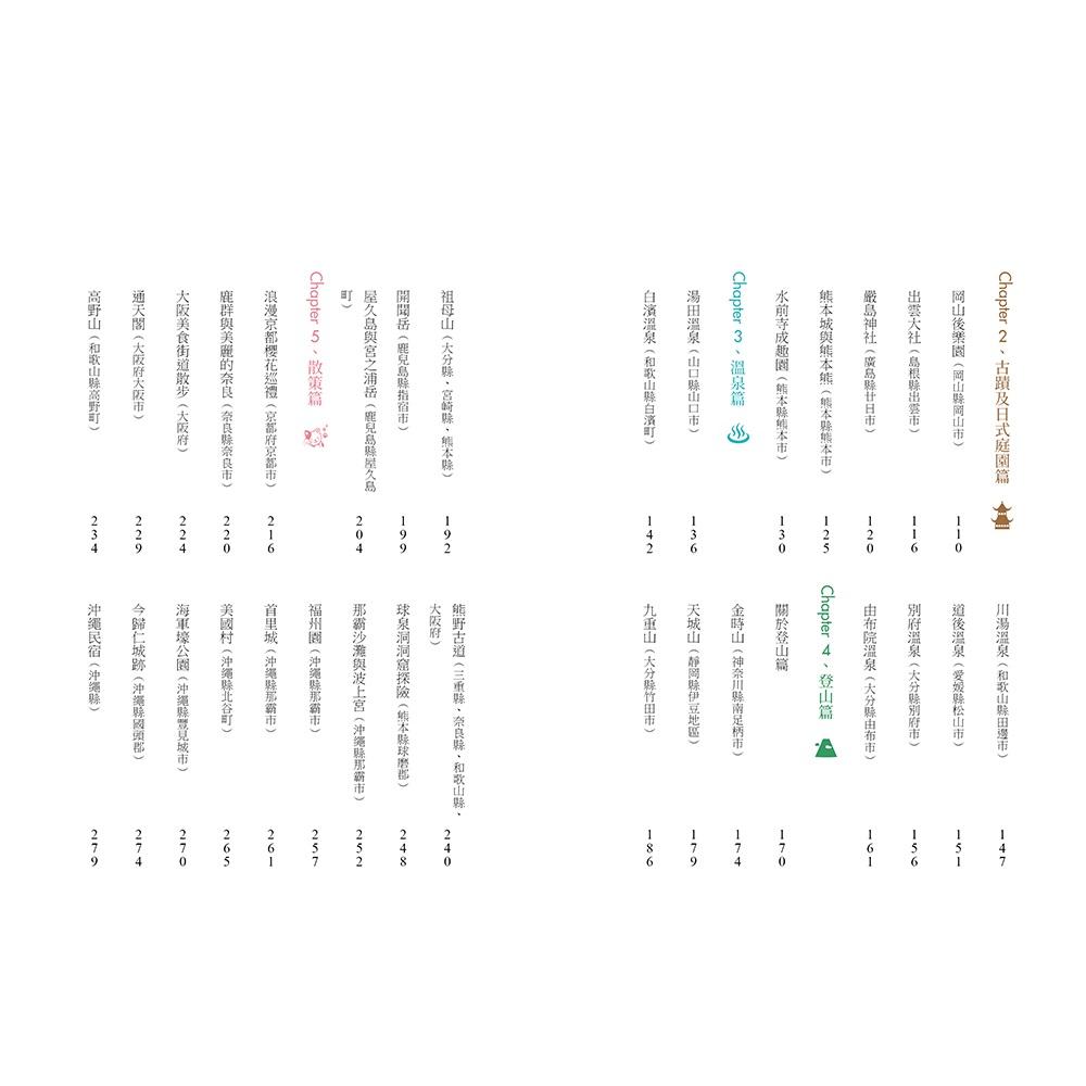 深度遊走幸福旅程,第一本北日本範圍,涵蓋北陸以北直達東北、北海道;第二本聚焦南日本,包含從東京到京都的東海道以及奈良、大阪、九州、四國、沖繩。