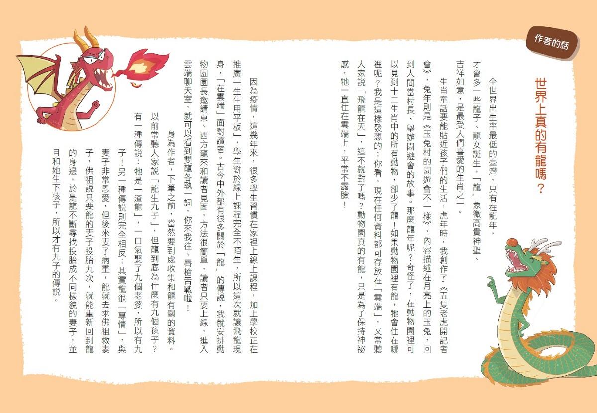 因為疫情,這幾年來,很多學生習慣在家裡上線上課程,加上學校正在推廣「生生用平板」,學生對於線上課程完全不陌生,所以這次就讓飛龍現身,「在雲端」面對讀者。古今中外都有很多關於「龍」的傳說,我就安排動物園園長邀請東、西方龍來和讀者見面,方法很簡單,讀者只要上線,進入雲端聊天室,就可以看到雙龍各執一詞,你來我往、脣槍舌戰啦!