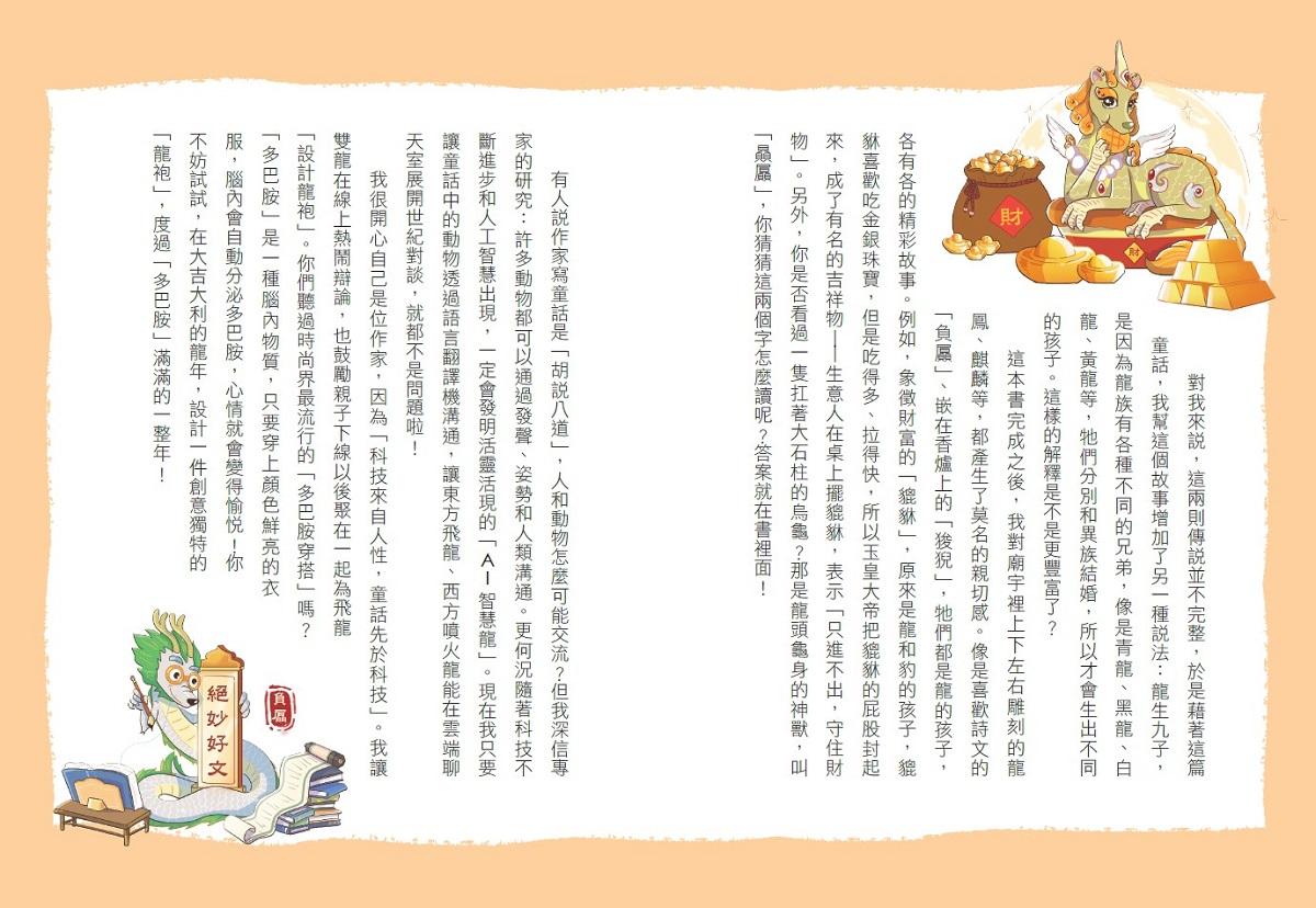 我很開心自己是位作家,因為「科技來自人性,童話先於科技」。我讓雙龍在線上熱鬧辯論,也鼓勵親子下線以後聚在一起為飛龍「設計龍袍」。你們聽過時尚界最流行的「多巴胺穿搭」嗎?「多巴胺」是一種腦內物質,只要穿上顏色鮮亮的衣服,腦內會自動分泌多巴胺,心情就會變得愉悅!你不妨試試,在大吉大利的龍年,設計一件獨特創意的「龍袍」,度過「多巴胺」滿滿的一整年!