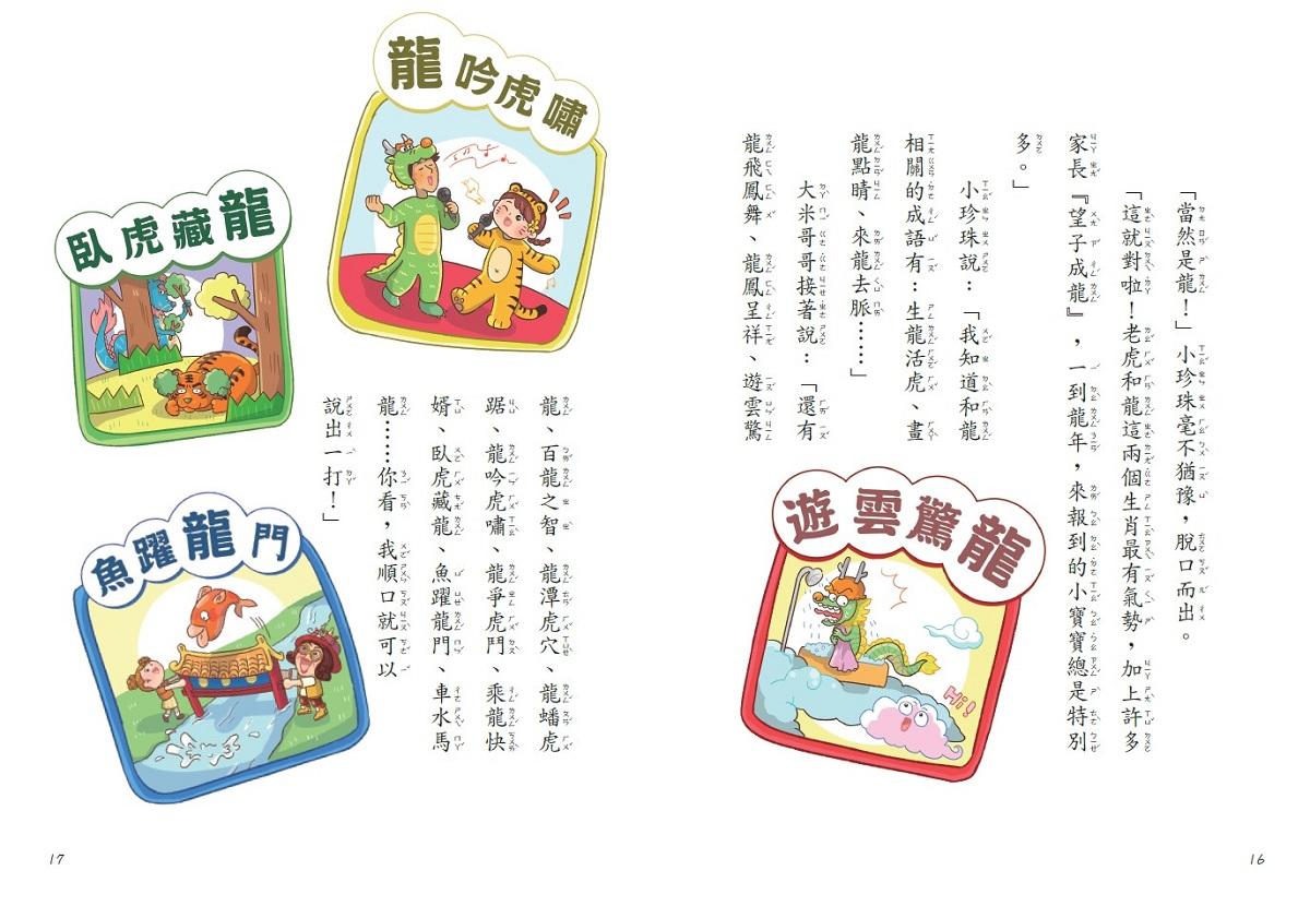 大米哥哥接著說:「還有龍飛鳳舞、龍鳳呈祥、遊雲驚龍、百龍之智、龍潭虎穴、龍蟠虎踞、龍吟虎嘯、龍爭虎鬥、乘龍快婿、臥虎藏龍、魚躍龍門、車水馬龍……你看,我順口就可以說出一打!」
