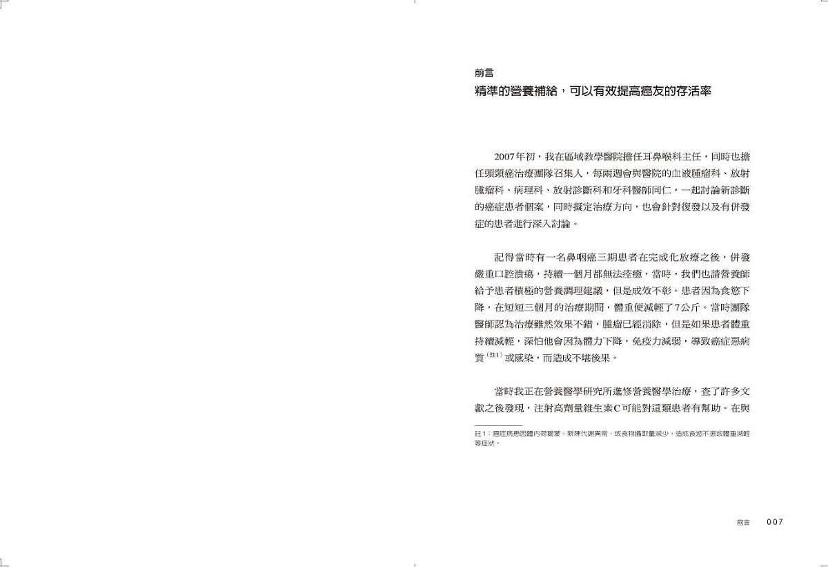 當時我正在營養醫學研究所進修營養醫學治療,查了許多文 獻之後發現,注射高劑量維生素 C 可能對這類患者有幫助。在與患者溝通後,將其收住院,然後每日靜脈注射維生素 C15 克(其 實現在我會注射更高劑量)。說也奇怪,患者口腔狀況一天比一 天好,過了一週後,口腔潰瘍好了大約八成,食慾改善不少。又 大約兩週後,體重回升 3 公斤,體力大好,當時我非常訝異,患 者也很開心,原來維生素 C 注射對於癌症患者有這麼大的好處。