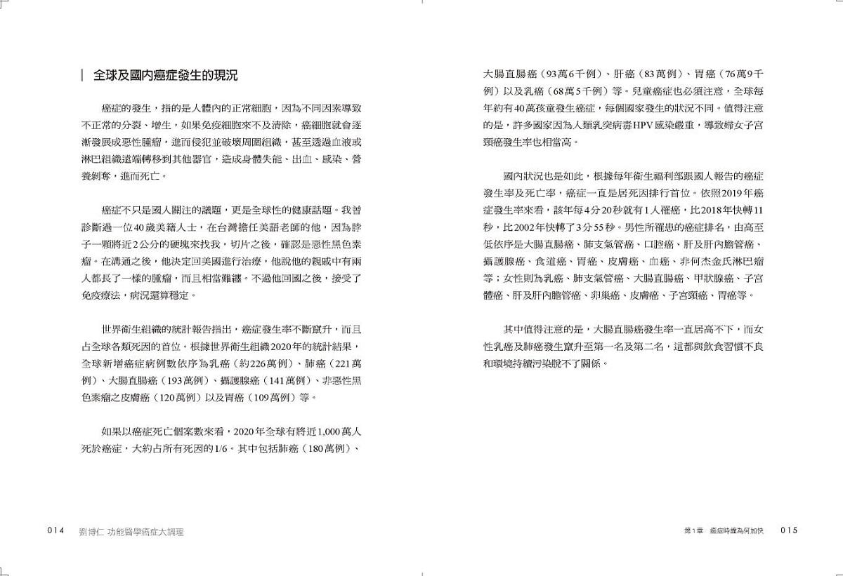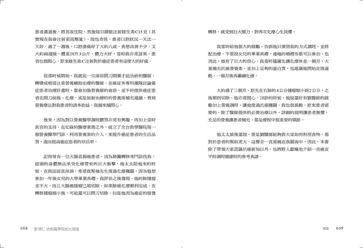 他太太最後還說,要是劉醫師能夠教大家如何料理食物,那 對於患者的幫助更大。這聲音一直縈繞在我腦海中,因此,本書 除了帶領大家認識抗癌新知以外,也將野人獻曝地介紹一些癌友 平時調理健康時的參考食譜。