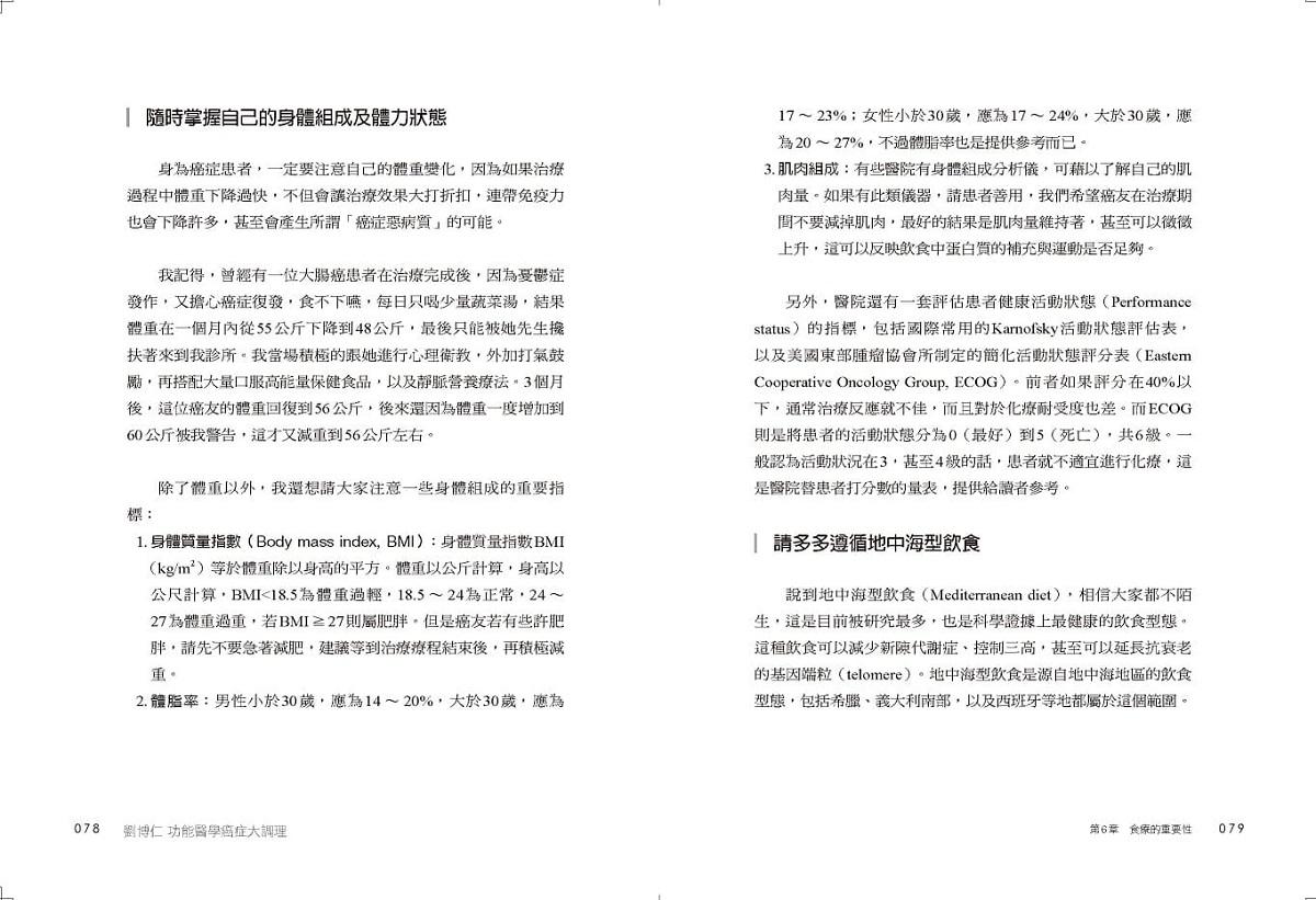8. 補足水分:許多癌友在化療期間,因為食慾欠佳,勉強用餐, 卻犧牲了喝水。記住,化療藥物很傷腎臟,這些藥物又需要經 過腎臟代謝,所以喝水排尿、排藥毒非常重要,一天請儘量喝 到 2,000 ~2,500c.c. 的水。我的一位患者在醫院接受化療時, 水喝得少,結果腎功能一下子從正常值掉到腎病第三期。後來,醫師先停止化療藥物,我也告知她要大量喝水,一週後腎 功能馬上恢復。
