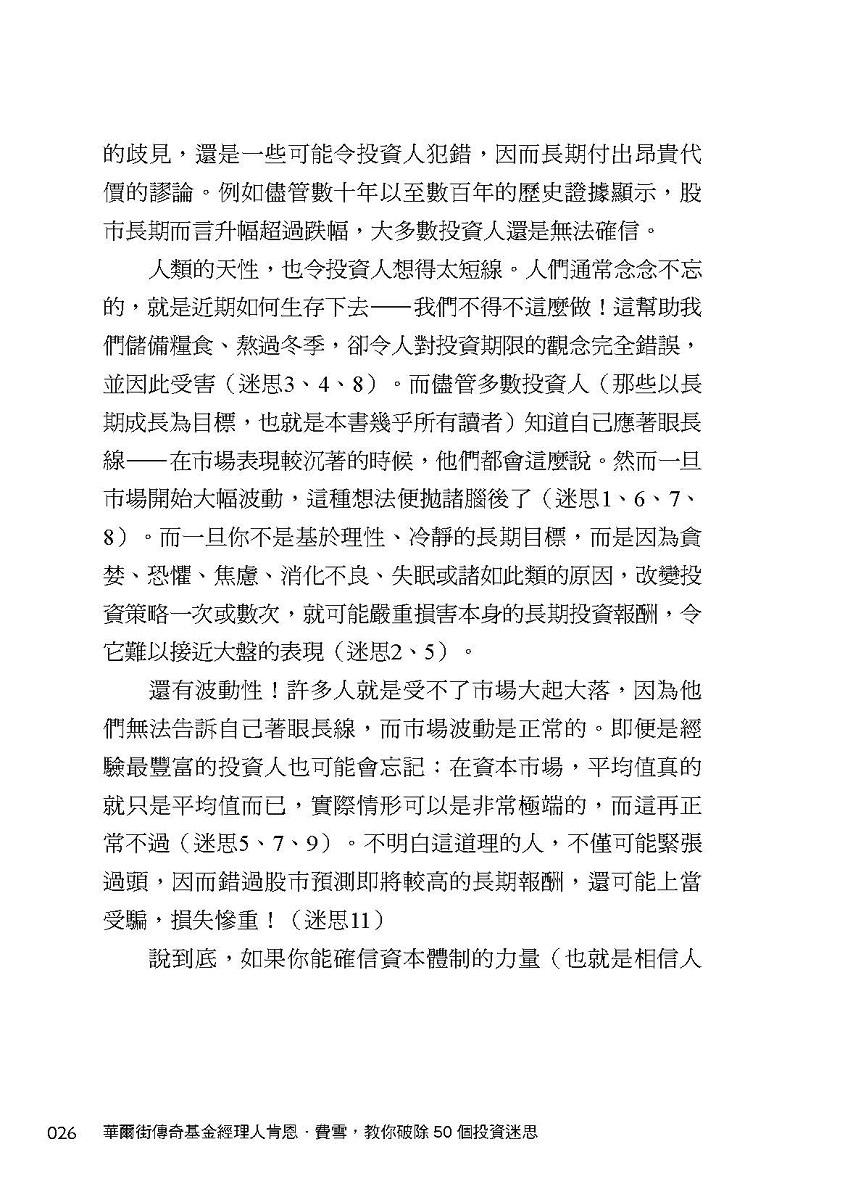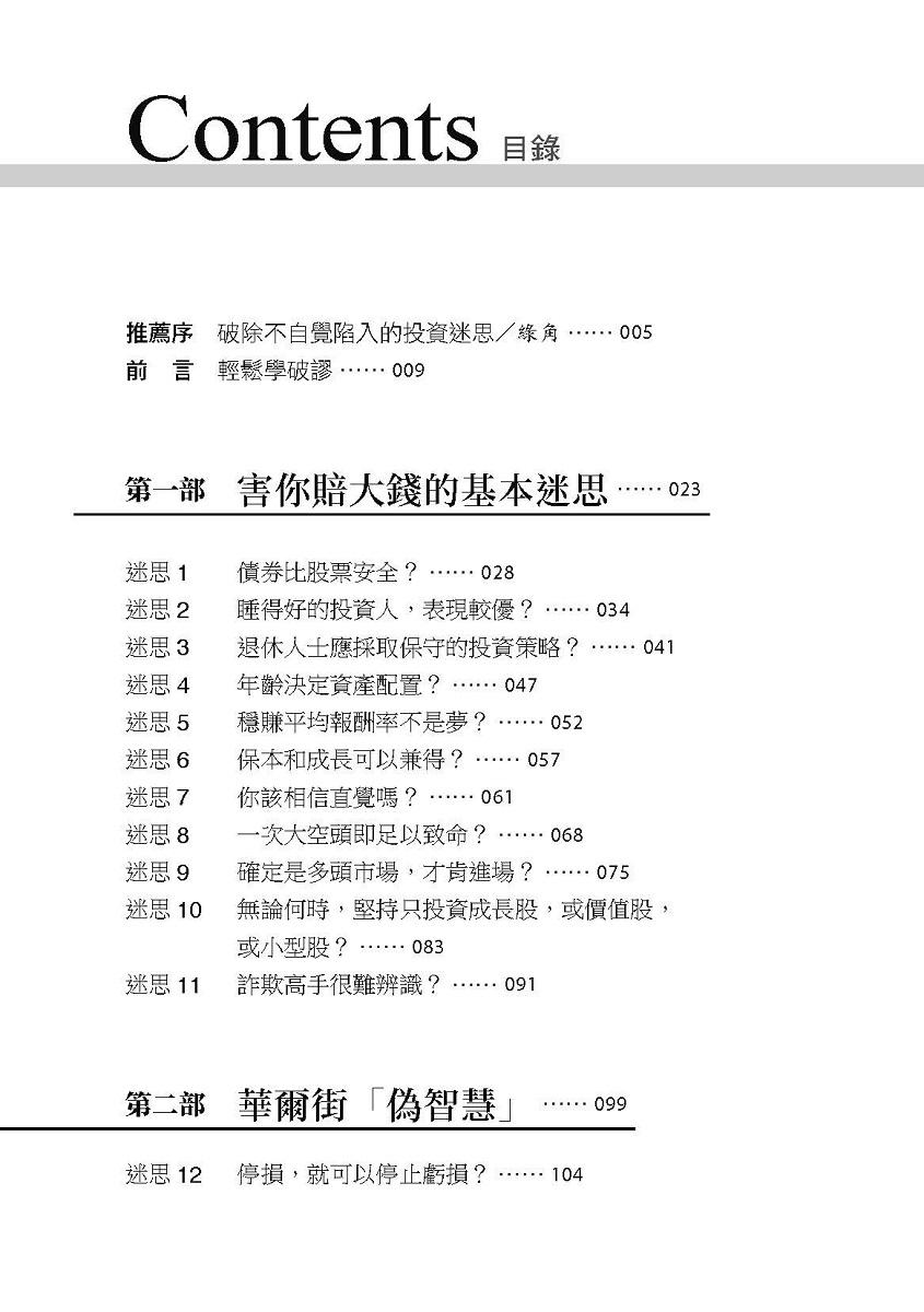 身為投資人,我們不能、更不必以「絕不犯錯」為目標,因為那是不可能的。就長期而言,投資人的目標應該是「做對決定」的機率要多過犯錯機率。所以,我們該做的是學會如何破除所有與投資相關的誤解,盡力降低犯錯機會,以有效提升投資報酬率。本書將助各位一臂之力,掌握正確的財務觀念,以在投資道路上能夠穩健前行。