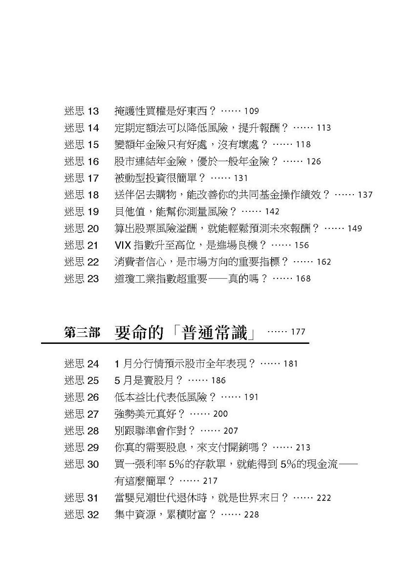 「本書以豐富的理據和清晰的邏輯,破除了很多廣泛流傳,但其實不正確的投資迷思,若是願意瞭解這些並進一步學習作者的思考方式,就能讓自己在投資的路上減少犯錯,少走很多冤枉路。」──Ffaarr,「Ffaarr的投資理財部落格」版主