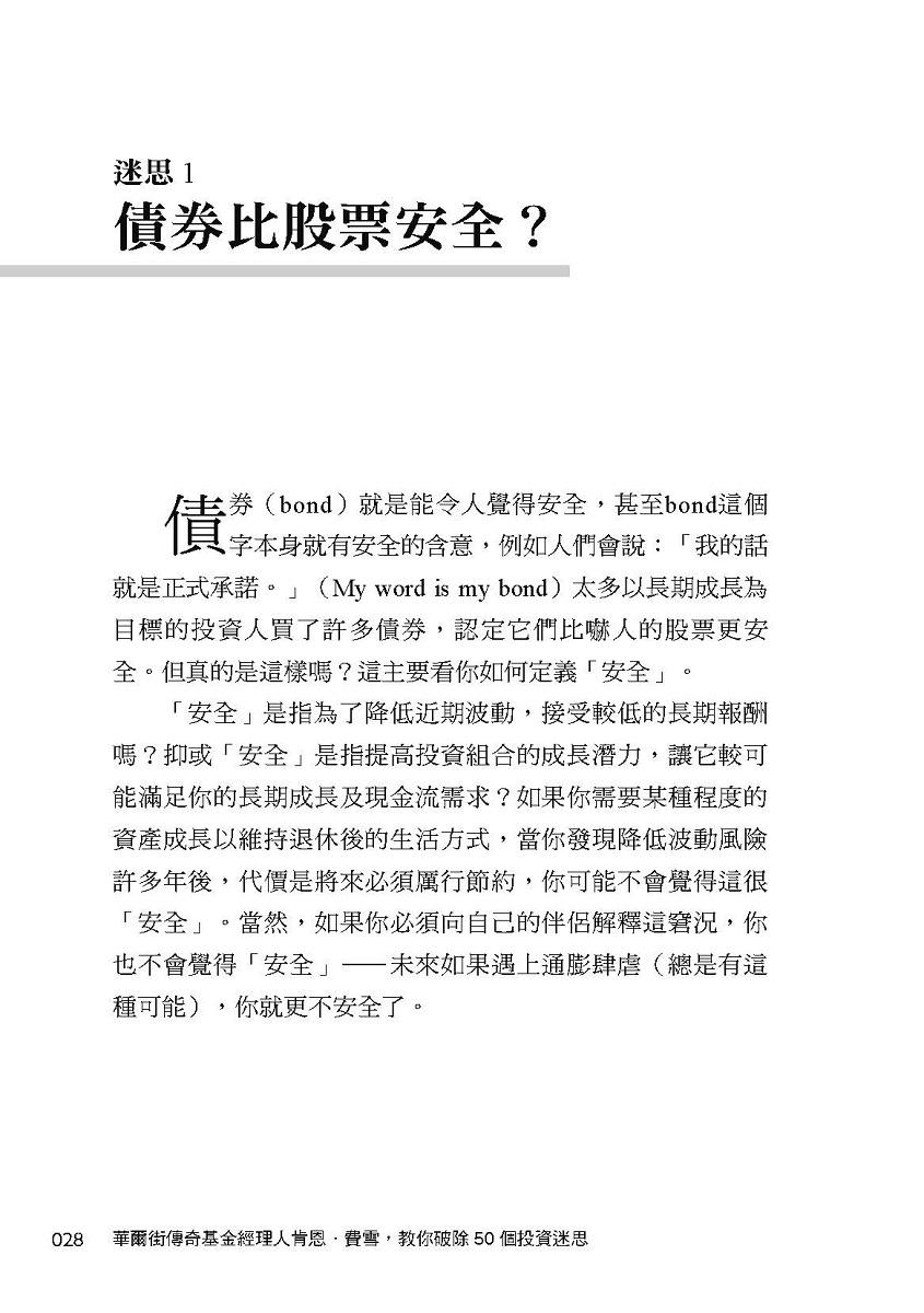 債券(bond)就是能令人覺得安全,甚至bond這個字本身就有安全的含意,例如人們會說:「我的話就是正式承諾。」(My word is my bond)太多以長期成長為目標的投資人買了許多債券,認定它們比嚇人的股票更安全。但真的是這樣嗎?這主要看你如何定義「安全」。