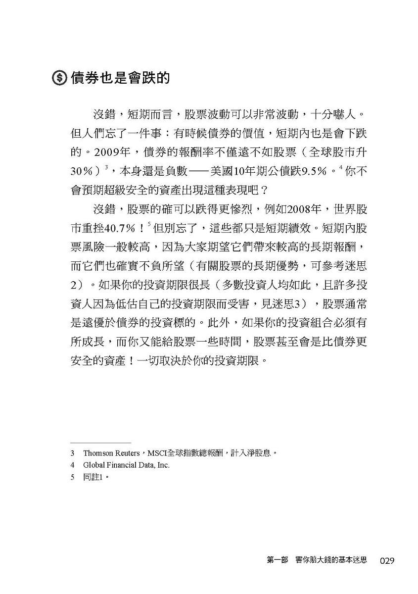 沒錯,股票的確可以跌得更慘烈,例如2008年,世界股市重挫40.7%!但別忘了,這些都只是短期績效。短期內股票風險一般較高,因為大家期望它們帶來較高的長期報酬,而它們也確實不負所望(有關股票的長期優勢,可參考迷思2)。如果你的投資期限很長(多數投資人均如此,且許多投資人因為低估自己的投資期限而受害,見迷思3),股票通常是遠優於債券的投資標的。此外,如果你的投資組合必須有所成長,而你又能給股票一些時間,股票甚至會是比債券更安全的資產!一切取決於你的投資期限。