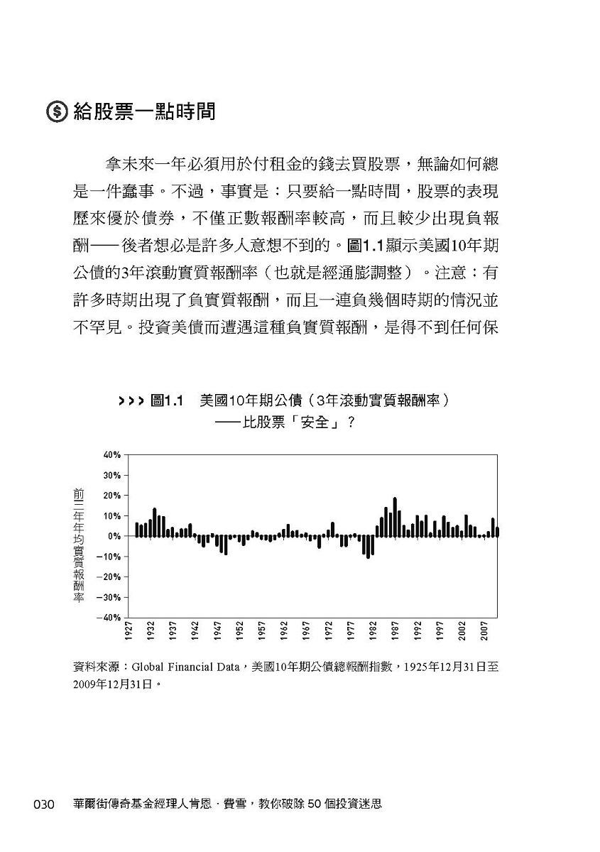 歷史績效從不能預測未來表現,不過歷史可以告訴我們什麼是合理期望。投資領域裡沒有必然的事,它就像醫療及許多科學領域,是講求機率的。如果你的投資期限是30年(這是許多投資人的情況,連一些已退休或接近退休的人也是這樣),那麼股票很可能對你比較有利。自1927年至2010年,共有54個30年期。股票報酬率在每一時期均超過債券,平均以4.8對1的壓倒性優勢勝出(見下頁表2.1)。