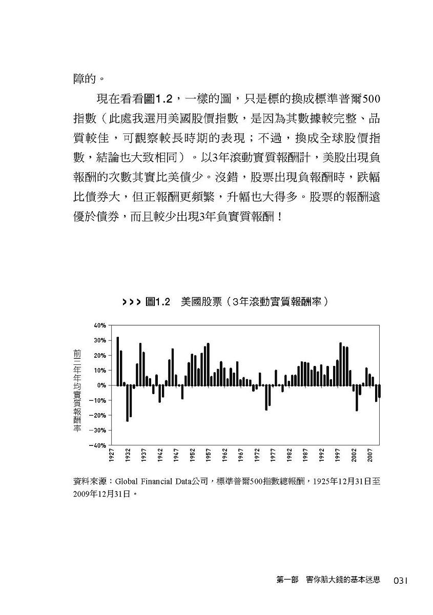 現在看看圖1.2,一樣的圖,只是標的換成標準普爾500指數(此處我選用美國股價指數,是因為其數據較完整、品質較佳,可觀察較長時期的表現;不過,換成全球股價指數,結論也大致相同)。以3年滾動實質報酬計,美股出現負報酬的次數其實比美債少。沒錯,股票出現負報酬時,跌幅比債券大,但正報酬更頻繁,升幅也大得多。股票的報酬遠優於債券,而且較少出現3年負實質報酬!