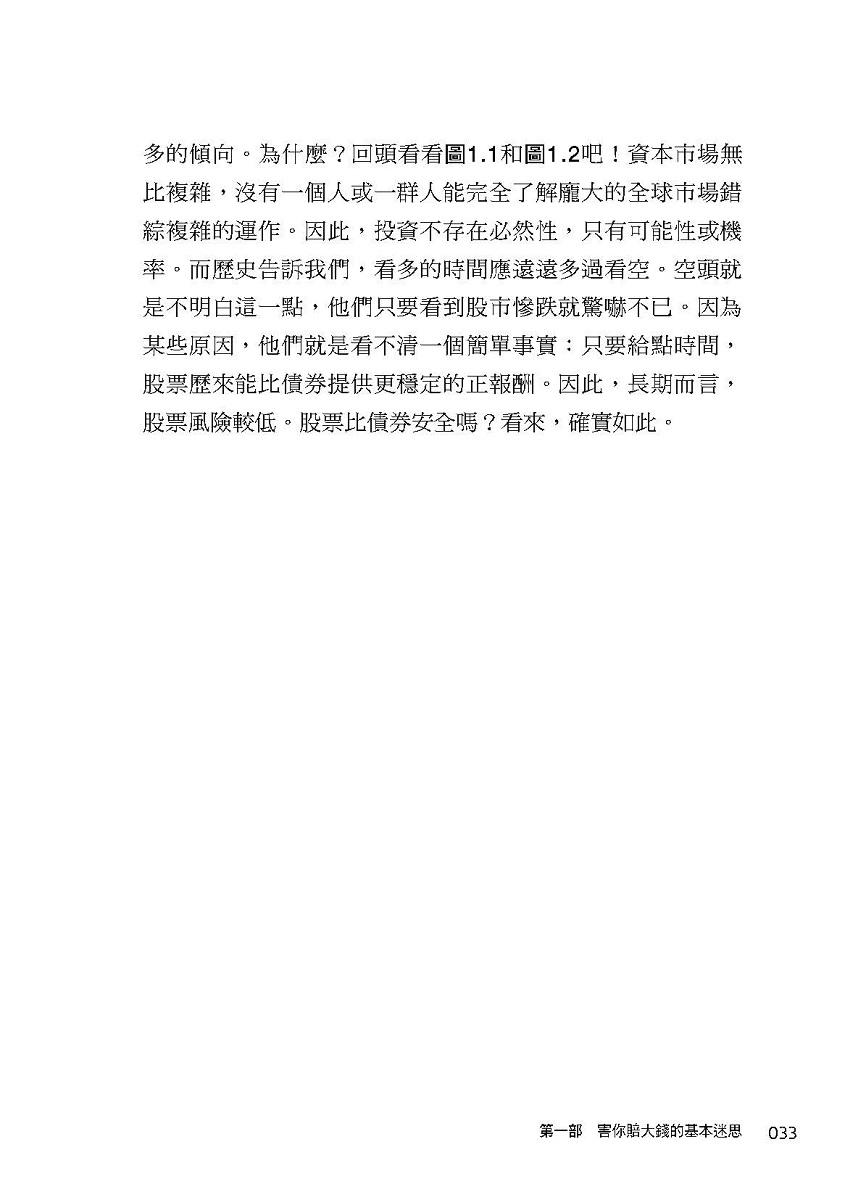 不過,如果我找不到看空的正當理由,那麼我的確有看多的傾向。為什麼?回頭看看圖1.1和圖1.2吧!資本市場無比複雜,沒有一個人或一群人能完全了解龐大的全球市場錯綜複雜的運作。因此,投資不存在必然性,只有可能性或機率。而歷史告訴我們,看多的時間應遠遠多過看空。空頭就是不明白這一點,他們只要看到股市慘跌就驚嚇不已。因為某些原因,他們就是看不清一個簡單事實:只要給點時間,股票歷來能比債券提供更穩定的正報酬。因此,長期而言,股票風險較低。股票比債券安全嗎?看來,確實如此。