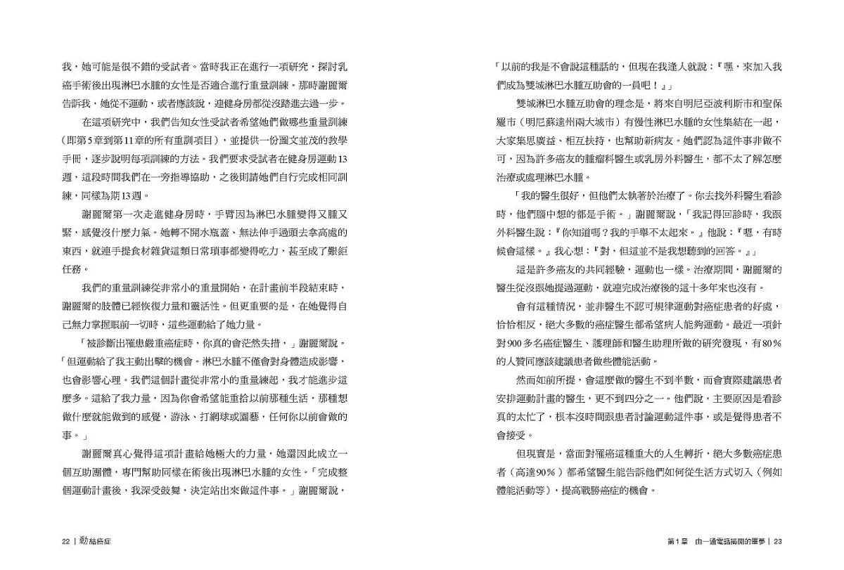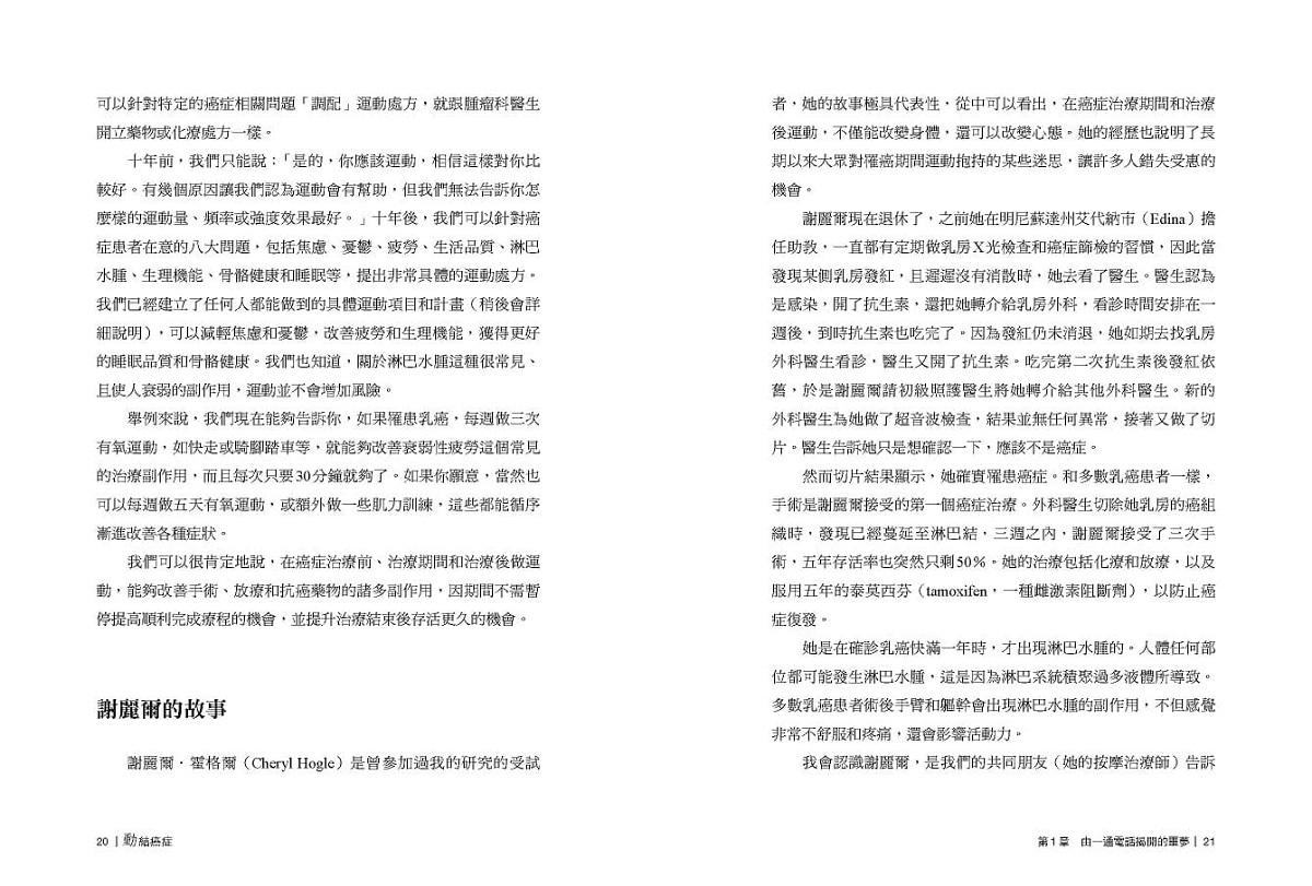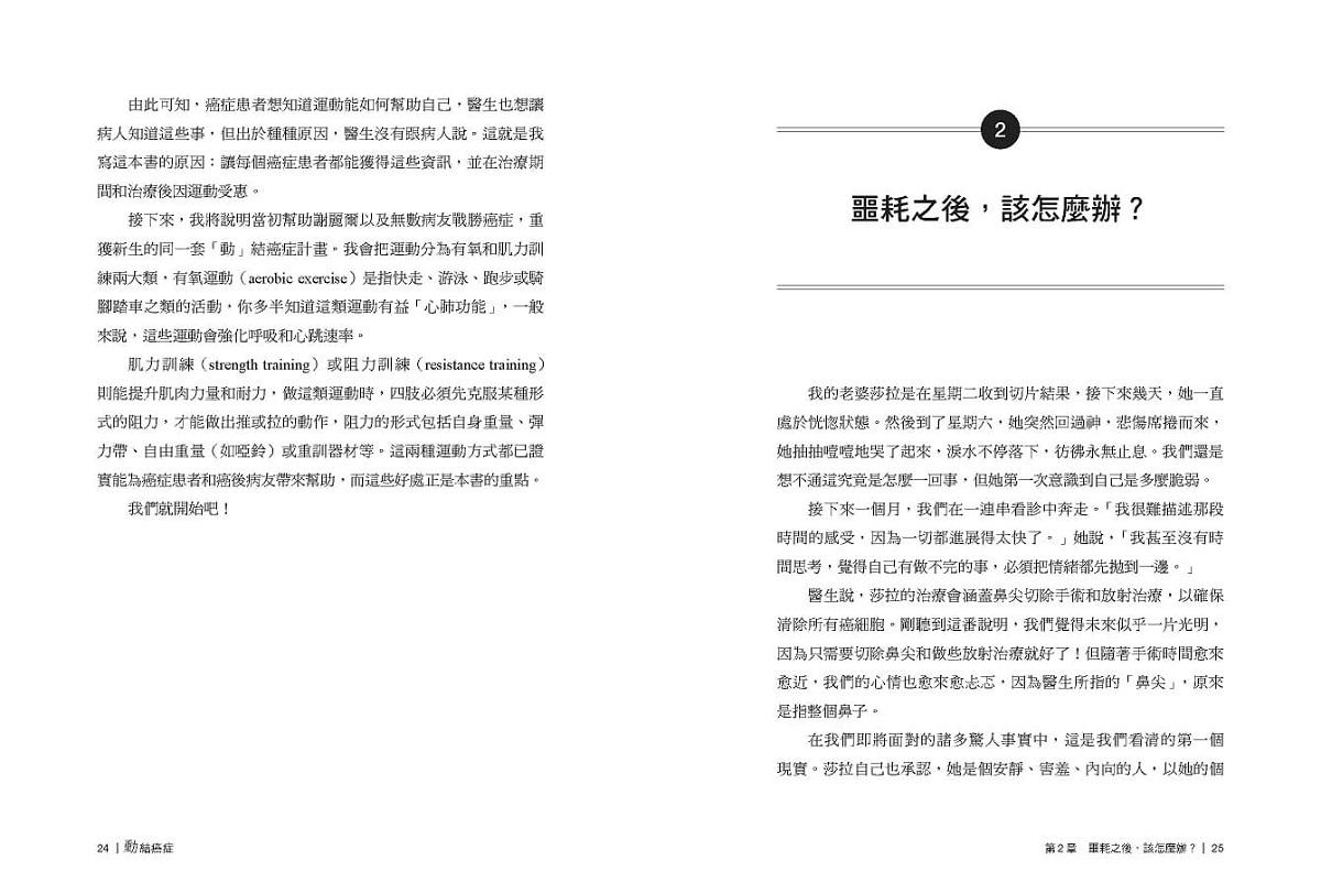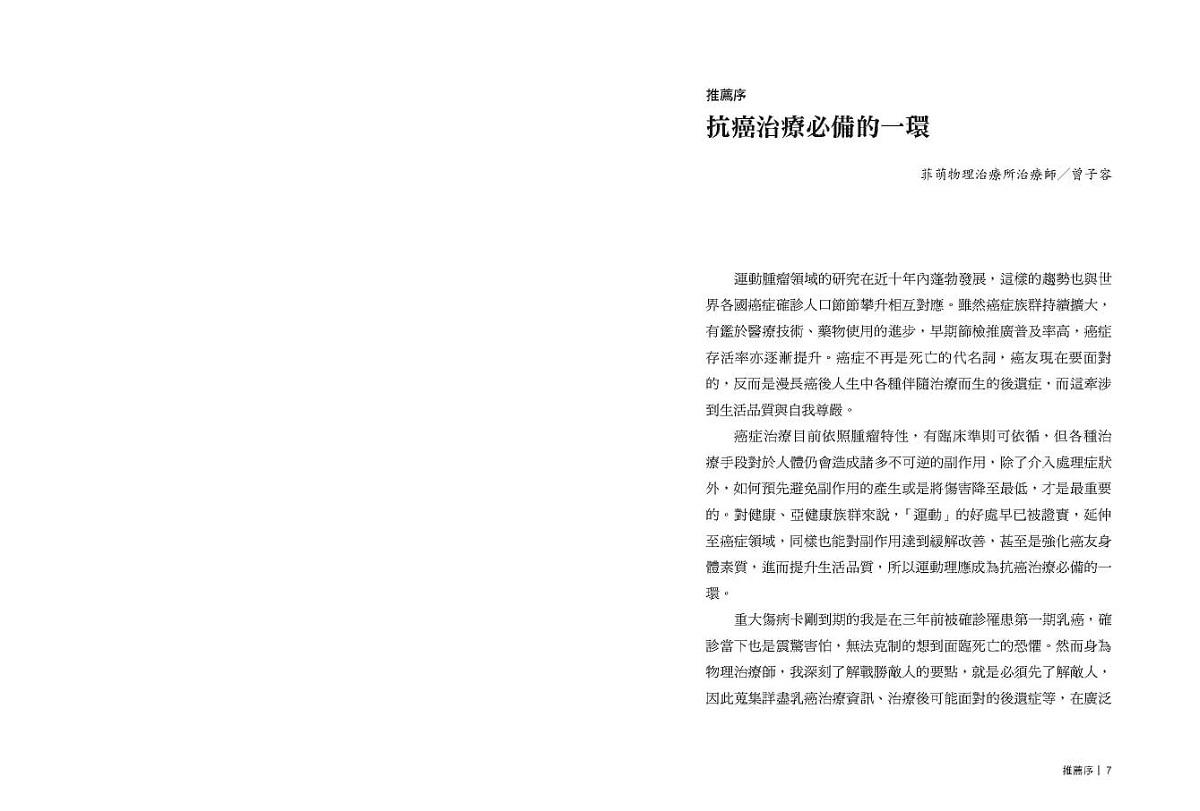 癌症治療分秒必爭,當時的我決定把自己當作一個小試驗體,搭配運動一起進行所有治療。確診癌症後的一個月內,我進行了單側乳房局部切除、全部切除、凍卵手術,遵循醫師醫囑外,每日也進行肩關節伸展運動與走路有氧運動,至今並沒有太多關節限制或疼痛的困擾;化學治療期間,如書中所說「傾聽身體的聲音」非常重要,我不會勉強自己在化療藥物作用最不舒服的時候還要達成設定的目標,就只是維持日常活動,甚至稍微動一下,至少不要整日躺著;狀況好的時候我會慢跑,漸進式的調整呼吸節奏,有時甚至可以連續跑2公里,而持續運動也讓我的疲憊感得到改善,每次施打化療藥物不舒服的日子也能較快緩解。