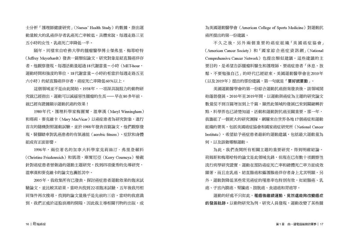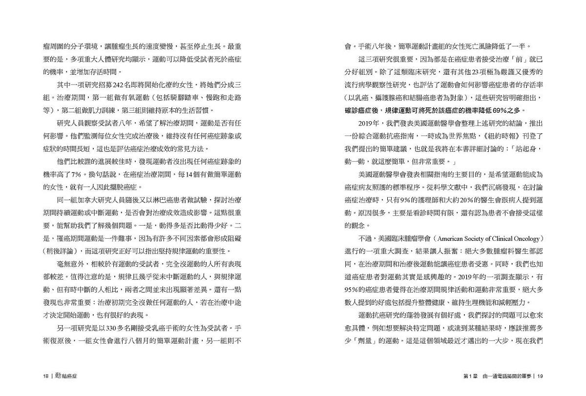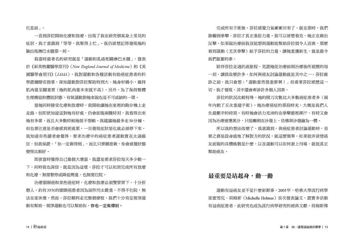 書中不僅提供清楚易懂的運動指引及圖解,還穿插許多鼓舞人心的真實故事,能為患者、醫生和照護人員注入新力量和新思維。就算你是運動新手,長期久坐不動,或是距離治療只剩幾天,只要願意站起身,動一動,即使只是簡單走路五分鐘,運動都能對身心健康和生活品質帶來極大幫助,你也能明顯感覺到自己的改變。