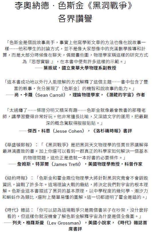 《華盛頓郵報》:「《黑洞戰爭》是把黑洞天文物理學的怪異世界講解得最淋漓盡致的書。加上你還可以看到一群真正的科學家如何解決一個基本的物理問題,這些正是造就一本好書的必要條件。」──詹姆斯・特菲爾(James Trefil),美國物理學教授,科普作家