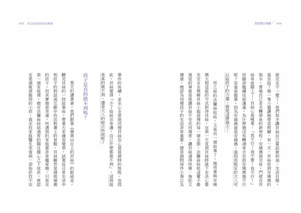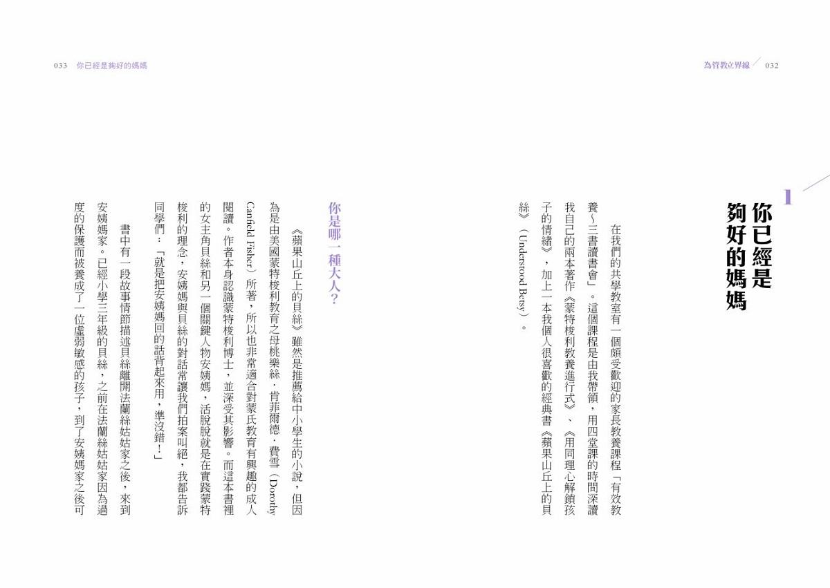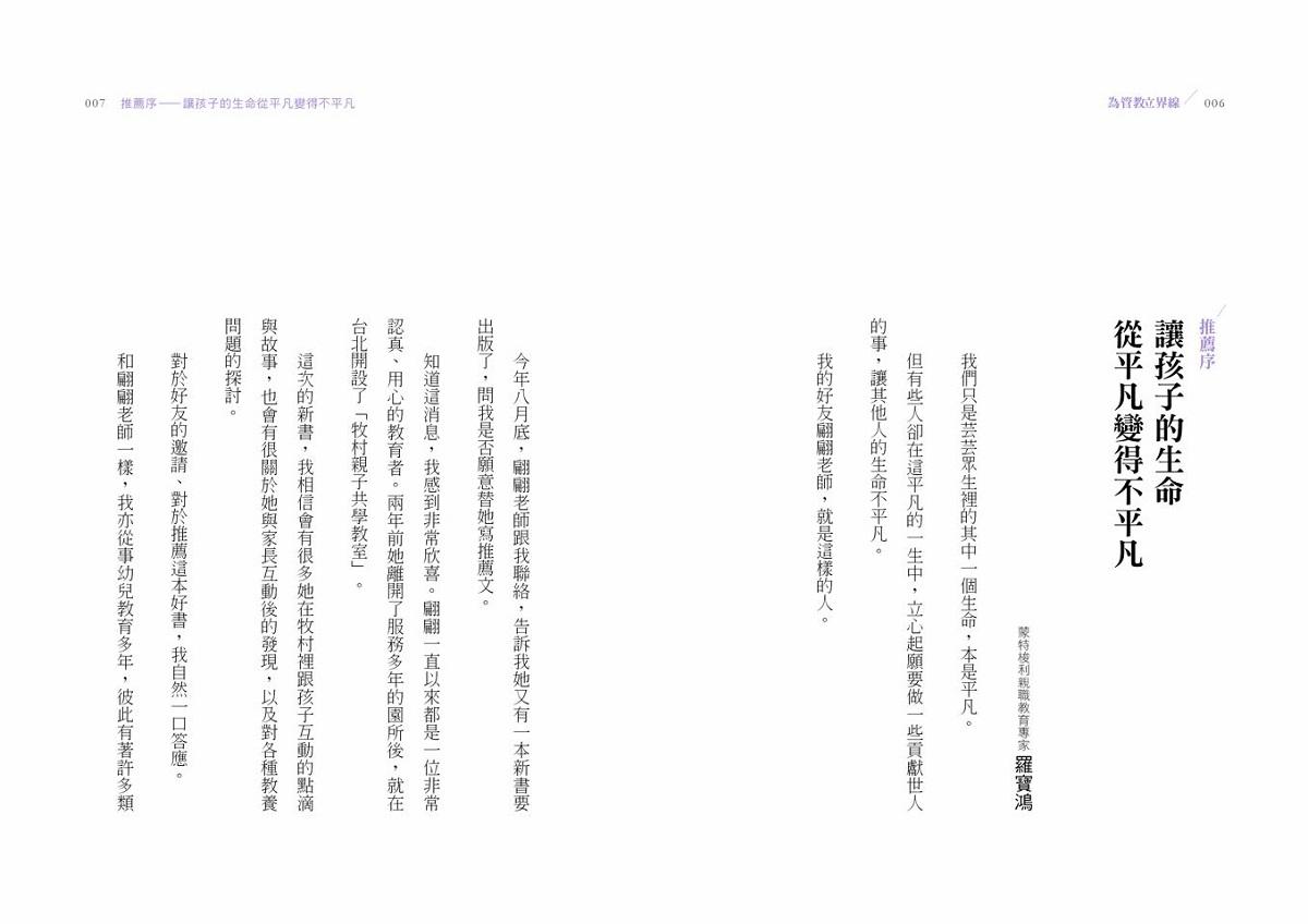 閱讀本書就像進入牧村親子教室裡的日常,在蒙式工作中,孩子的慣性、父母的反應,都隨著翩翩老師的細微觀察,因著清楚說明與示範,帶入專業知識,讓懸在心上的教養困境有了安穩落地。同時,牧村也是許多父母又愛又怕的第一現場,赤裸裸的教養現形記,現形的不只是孩子,也是父母。在牧村呈現的真實,就如同在親子家族治療時,在諮商室對話張力,真實互動無所遁逃。真實或許難以面對,尤其是還沒準備好的父母,然而,翩翩老師真誠分享自身經驗,雙手送上禮物—用愛說真心話,讓同樣身為母親的我,如千千萬萬受惠的父母,為此用心深深感動著。這本書,推薦給天下的父母、孩子的照顧者,讓我們一起用愛「為管教立界線」。——————吳孔琪 / 諮商心理師