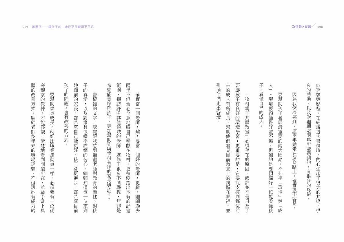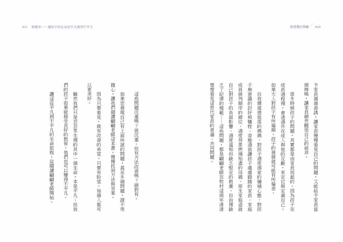 書稿裡的文字,在在處處都讓我感到翩翩老師對教育的熱忱,對孩子的真愛,以及對家長恨鐵不成鋼的苦心。翩翩知道每一位來到她面前的家長,都希望自己能更好、孩子會更進步,都希望目前孩子的問題,會有改善的方式。