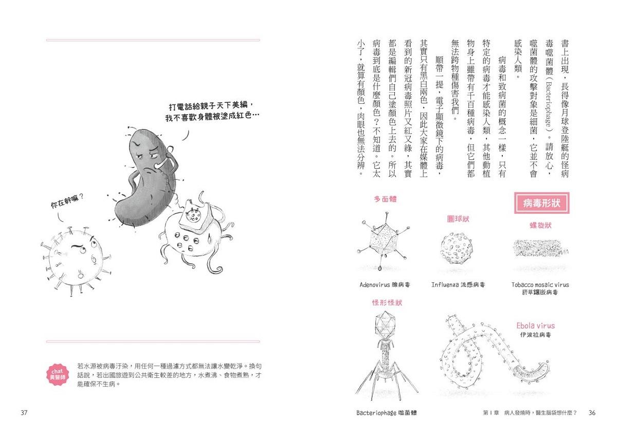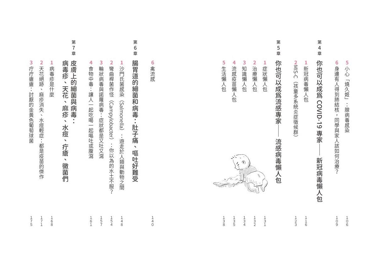 在這本《黃瑽寧醫師感染輕百科》的文字中,我期許能讓每一個年齡層的讀者,從中學生到老師與家長,都能讀懂書中的內容。除了將文字更加精簡之外,也邀請插畫家楊開翔與我共同創作,藉由輕鬆的漫畫,將生硬的知識轉為幽默的小劇場。
