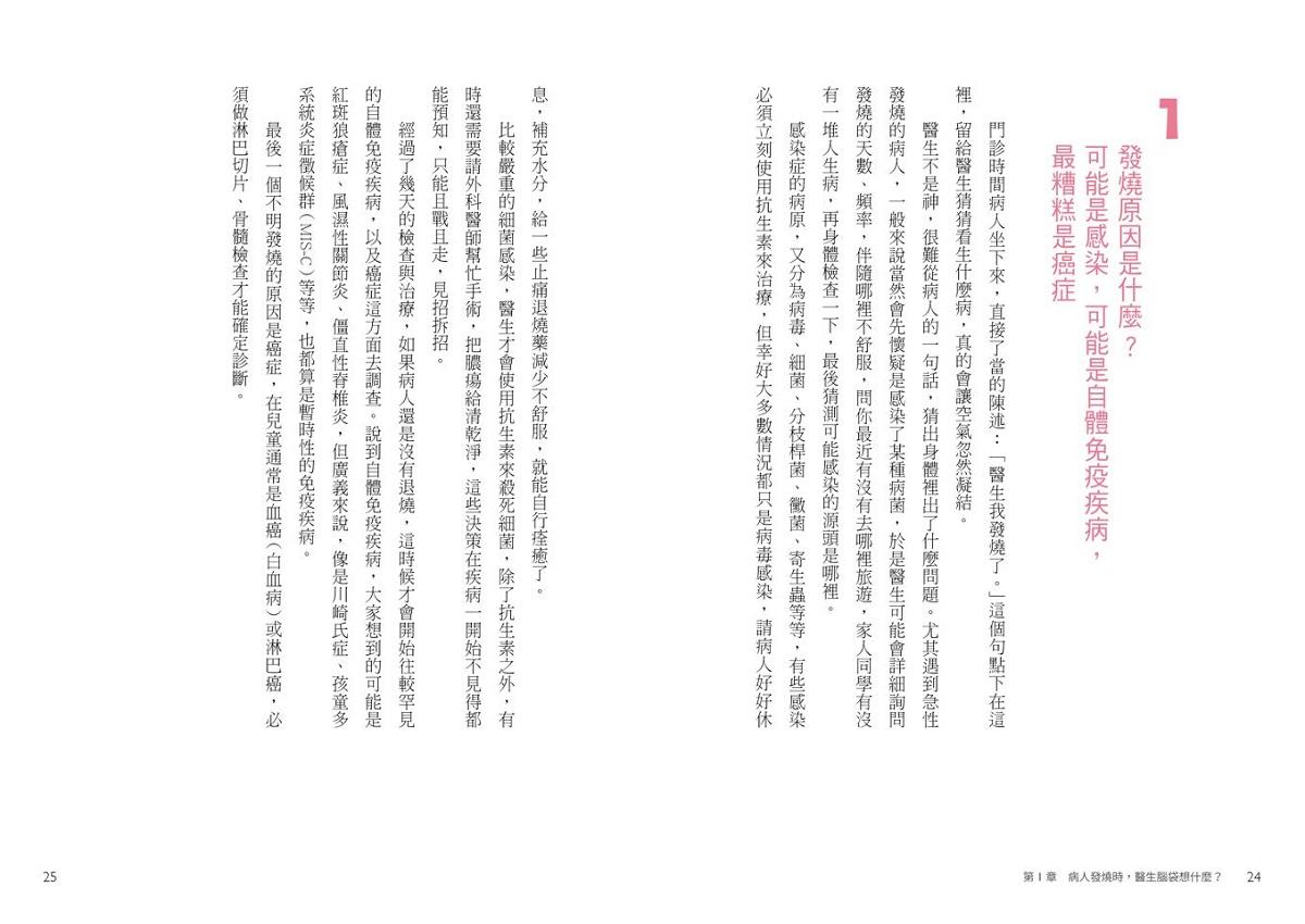 身為一個媽媽,每當小孩身體出了一點狀況就緊張的要命……例如常見的誤解是「發燒會燒壞腦袋」,當孩子發燒家長或長輩趕緊給孩子吃退燒藥、想辦法退燒,若燒壞腦子就糟糕了!但正確觀念如書上寫的,「發燒不是造成傷害的原因,只是生病的症狀,找出引起發燒的原因才是重點!」