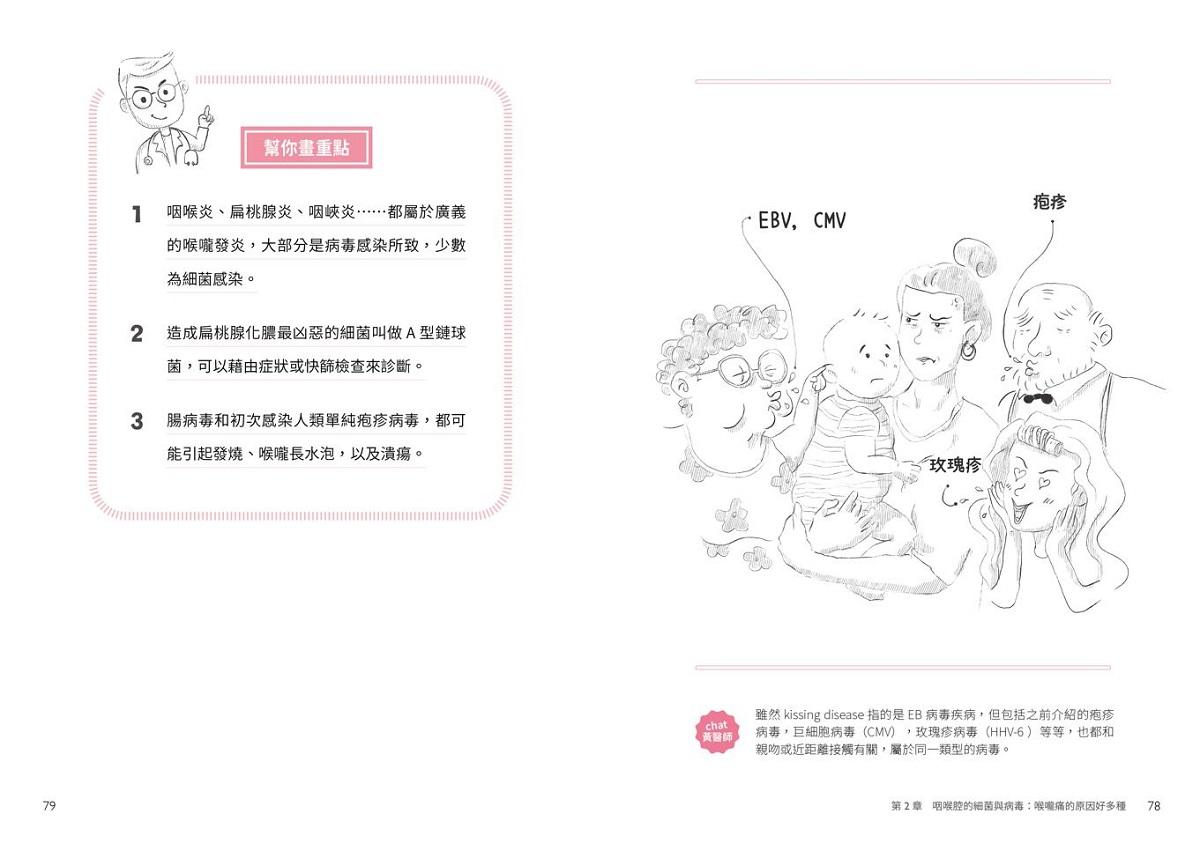幾年後,我已升級為三寶爸,體驗過「老大照書養、老二照豬養、老三隨便養」後,閱讀到黃醫師最新力作《黃瑽寧醫師感染輕百科》如獲至寶。主題包含發燒、喉嚨痛、咳嗽、腸胃道疾病、皮膚疾病、流行性感冒、蚊蟲叮咬、懷孕留意事項,甚至是最近大家非常關心的新冠肺炎整理成懶人包、流感染人包與各式疫苗都有詳細的介紹,非常實用。生動有趣的文字與漫畫,令人困惑的專有名詞,使用日常生活的舉例讓讀者容易理解。