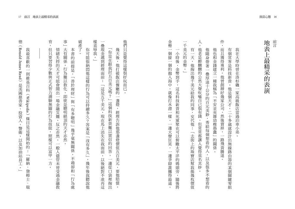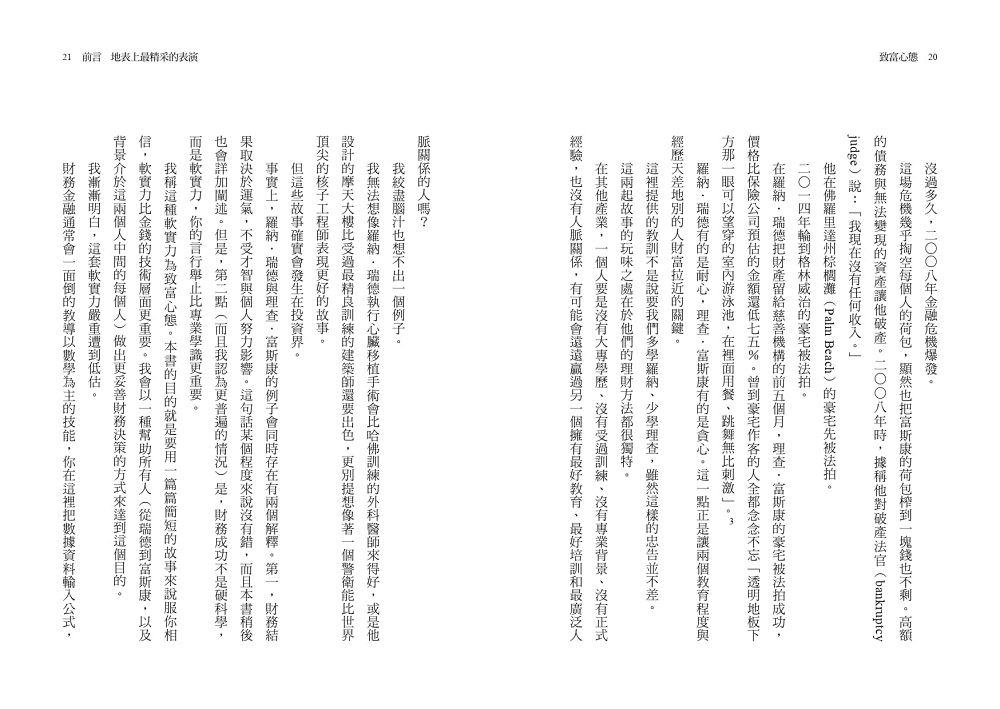 我稱這種軟實力為致富心態。本書的目的就是要用一篇篇簡短的故事來說服你相信,軟實力比金錢的技術層面更重要。我會以一種幫助所有人(從瑞德到富斯康,以及背景介於這兩個人中間的每個人)做出更妥善財務決策的方式來達到這個目的。