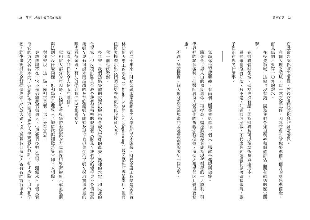 這本書談的觀念與我在去年出版的《財務自由的人生》類似,雖然沒有教導你如何炒股票或投資賺大錢,但是教導你如何正確看待金錢的意義與理財行為,這我覺得比賺錢還重要。因為錢賺的再多,如果無法妥善理財,也是沒有用。作者在我常閱讀的《華爾街日報》(The Wall Street Journal)和財經網站萬里富(The Motley Fool)當過多年的專欄作家,所以在這本書裡面寫了很多自己的理財故事及概念,不但很有用,也很容易了解。