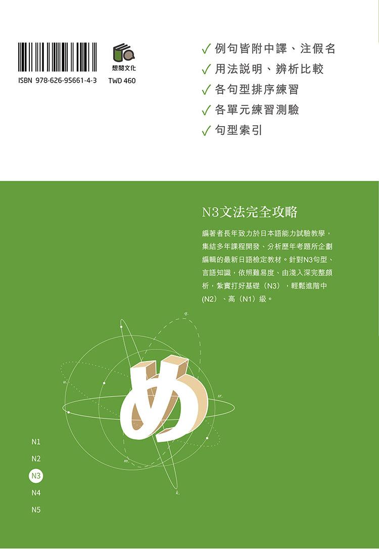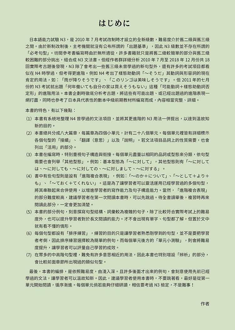 日本語能力試驗N3,是2010年7月考試改制時才設立的全新級數,難易度介於舊二級與舊三級之間。由於新制改制後,主考機關就沒有公布所謂的「出題基準」,因此N3級數並不存在著所謂的「必考句型」。坊間許多參考書編寫時由於無所適從,許多書籍就只是將舊二級較簡單的部分與舊三級較困難的部分挑出,組合成N3文法書。但經作者群詳細分析2010年7月至2018年12月份共18回實際考古題後發現,N3除了會考出一些舊三級未曾學過的新句型外,還有許多的考試項目都看似在N4時學過,但考得更進階。例如舊制三級考出了樣態助動詞「~そうだ」其動詞與形容詞的現在肯定的用法,如:「雨が降りそうです」、「このリンゴは美味しそうです」。但 2011年的七月份的N3考試就出題「何年働いても自分の家は買えそうもない」這種「可能動詞+樣態助動詞否定形」的進階用法。本書企劃時徹底分析考古題,將這些有可能出題、或已經出提過的進階表現一網打盡,同時也參考了日本具代表性的數本中級前期教材所編寫而成,內容相當完整、詳細。