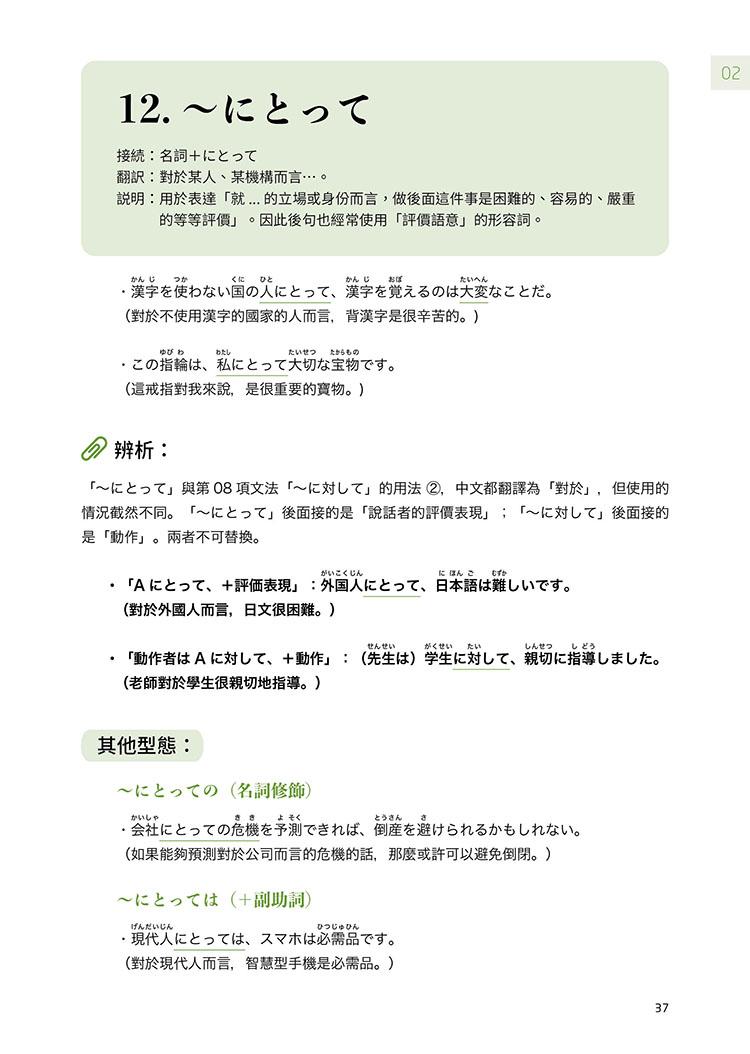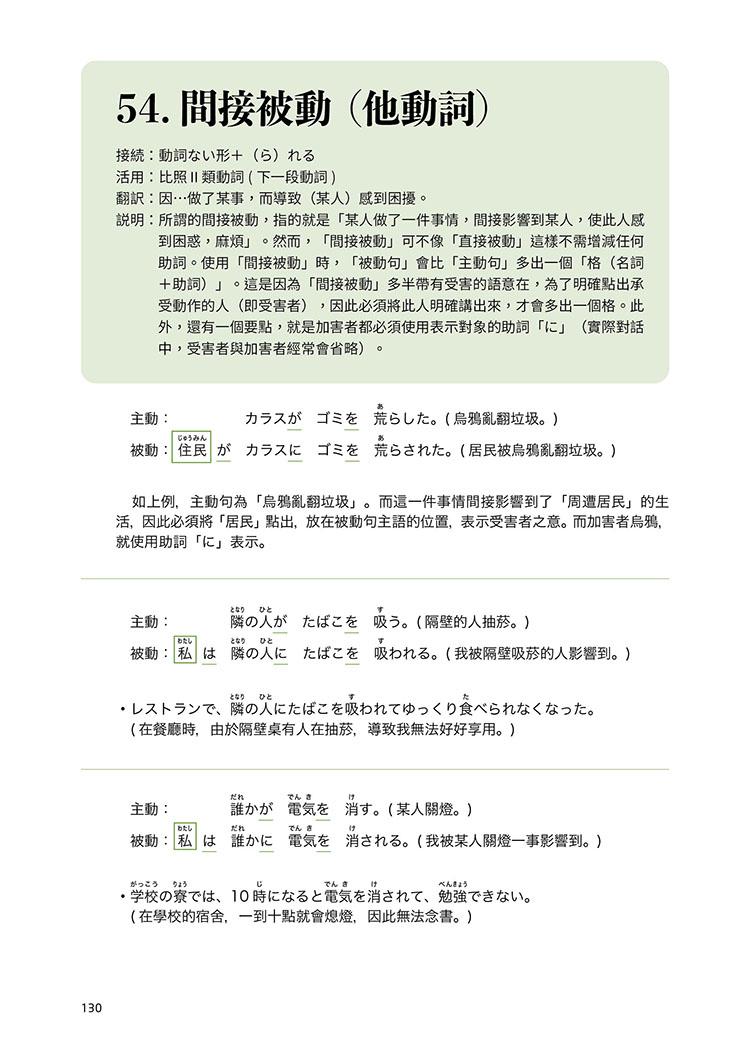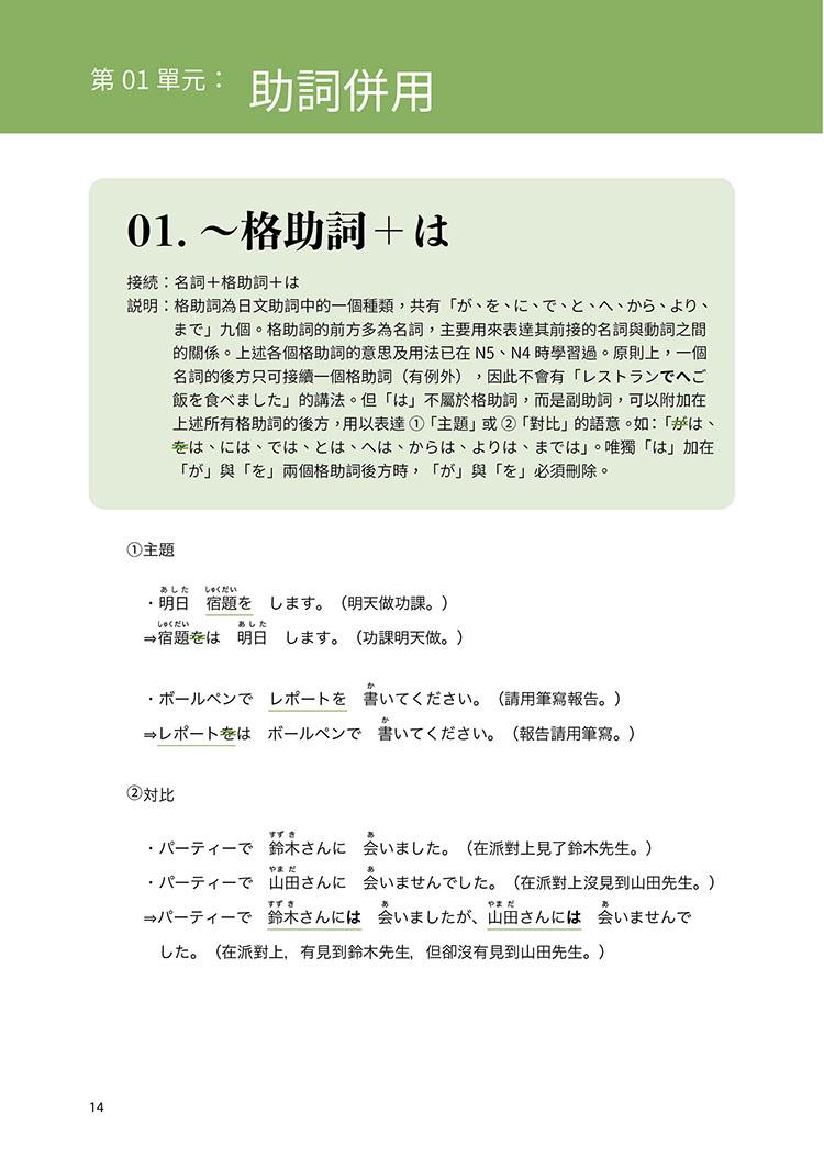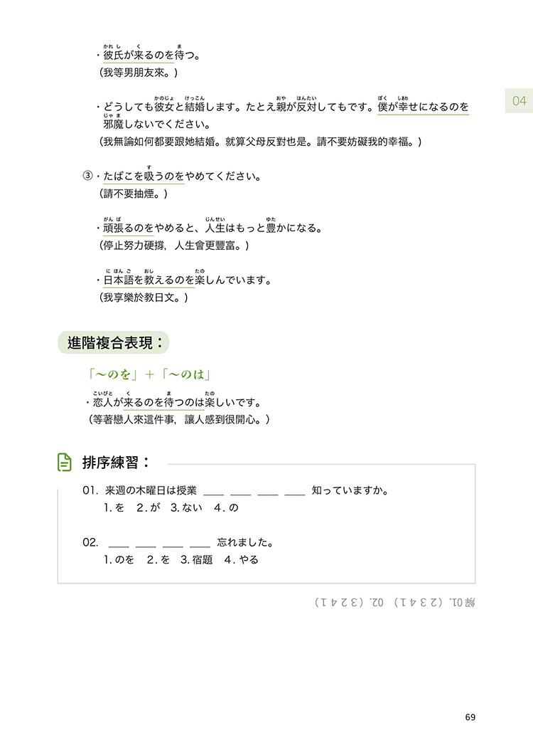 此外,本書亦詳細列舉出各句型的各種活用型態,並適時加入難度較高的「進階複合表現」,讓學習者解句型與句型之間如何結合、運用。
