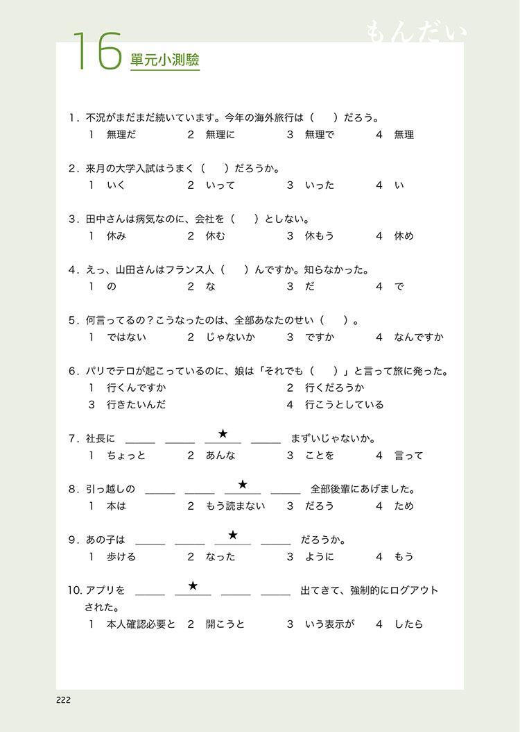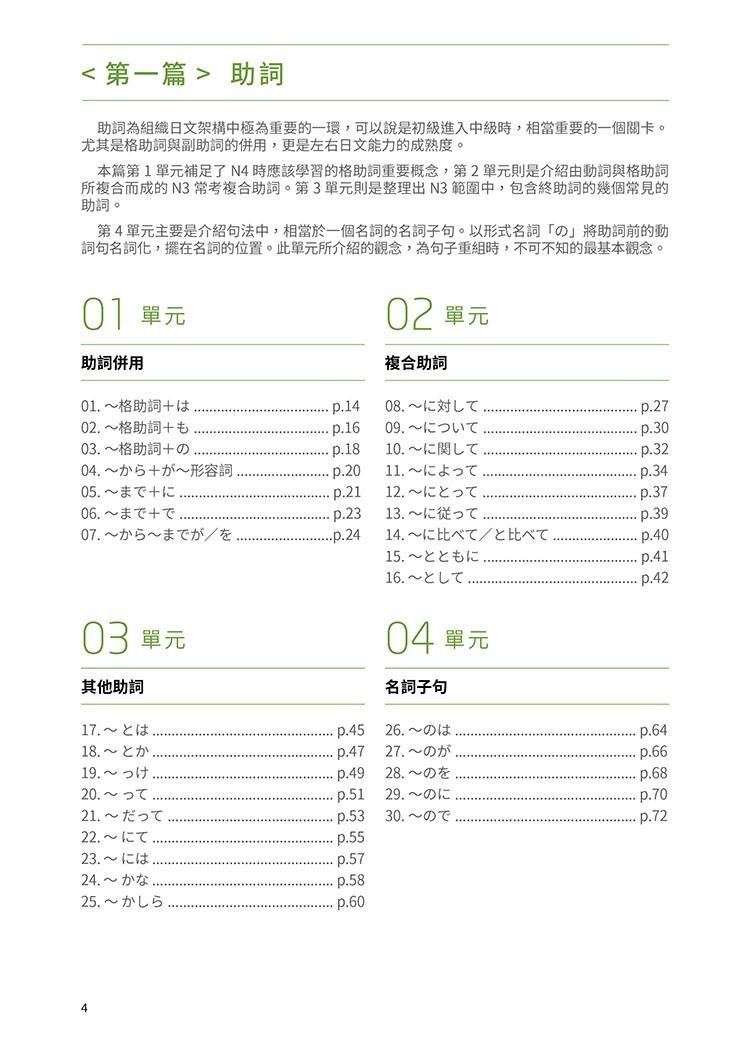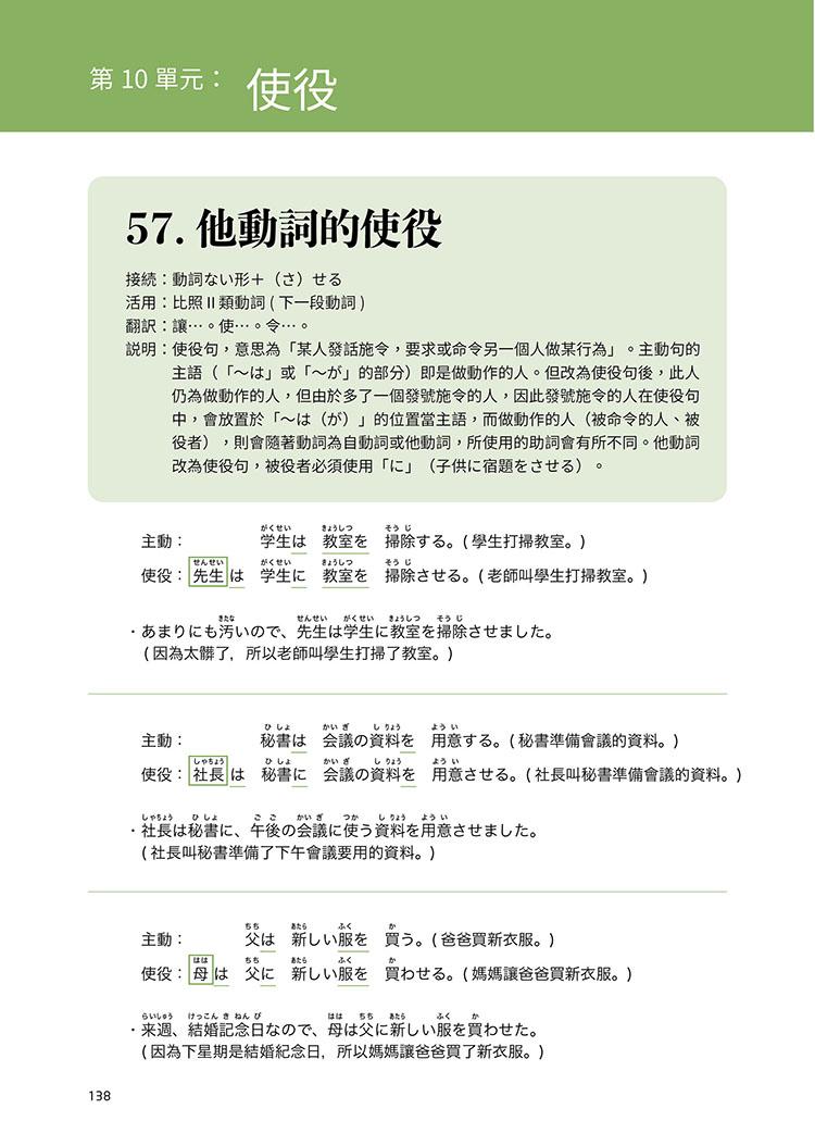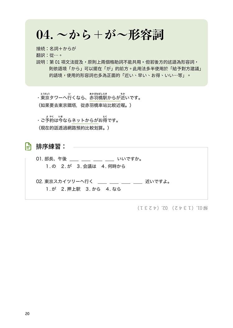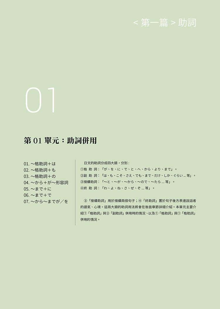 此外,本書亦詳細列舉出各句型的各種活用型態,並適時加入難度較高的「進階複合表現」,讓學習者解句型與句型之間如何結合、運用。