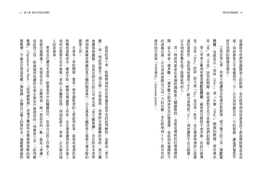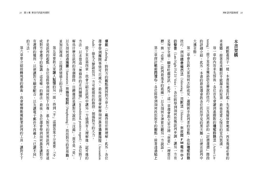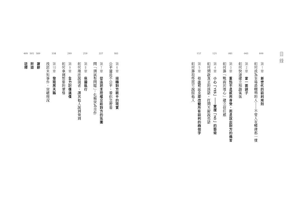 每一章的內容承先啟後,各位首先會讀到進階版的積極聆聽法(Active Listening),接下來是各種話該怎麼說的技巧,以及談判最終的「討價還價」階段的詳細介紹。此外,本書的最後還會教各位找出罕見的黑天鵝,以便在談判中大獲全勝。