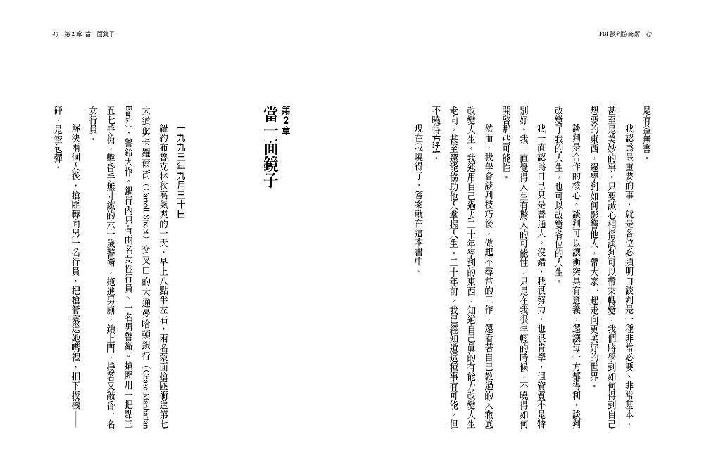 我要自己冷靜下來。沒錯,我只不過是個從巡警轉任FBI探員的小角色,而眼前是貨真價實的重量級大人物。然而,就算不聰明,我會被請到這裡,代表我有能力。過去這些年,我學到各式各樣人際互動的技巧、策略與方法。現在回想起來,我除了救過別人的命,自己的人生也起了變化,因為談判經歷影響了我所有的做事方法,不論是和客服人員說話的方式,或是教育孩子的風格,全受到左右。