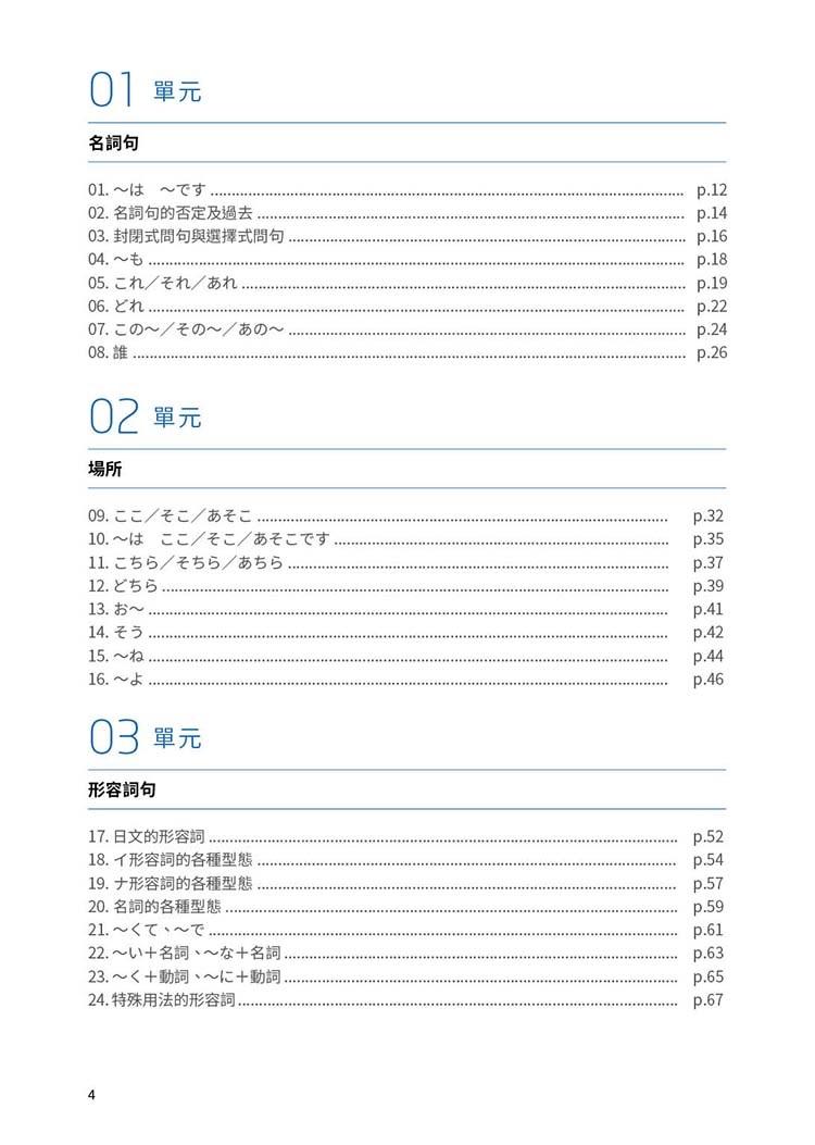 本書適合已熟悉日語平假名、片假名,且稍微學習過日語入門前幾堂課程的讀者閱讀。編排上,是依照難易度,由淺入深。各文法項目的例句,盡可能使用前面章節已學習過的文法,但對話及閱讀的部分會預先使用下一單元或者下兩單元即將學習的文法,事先預習。這些使用到後面才會出現的文法時,也會於例句後方加上參照註明。