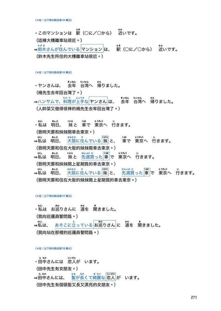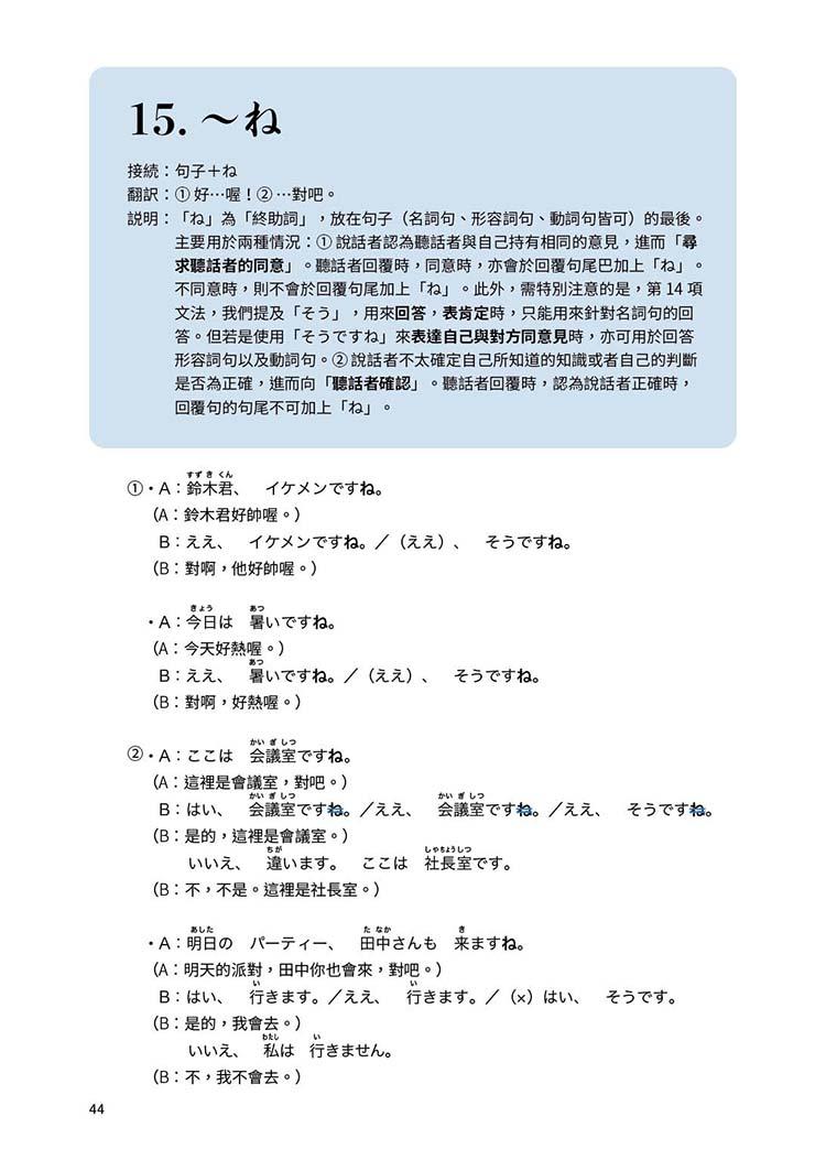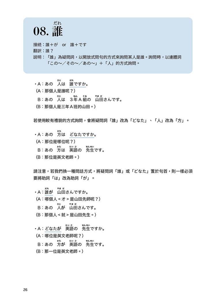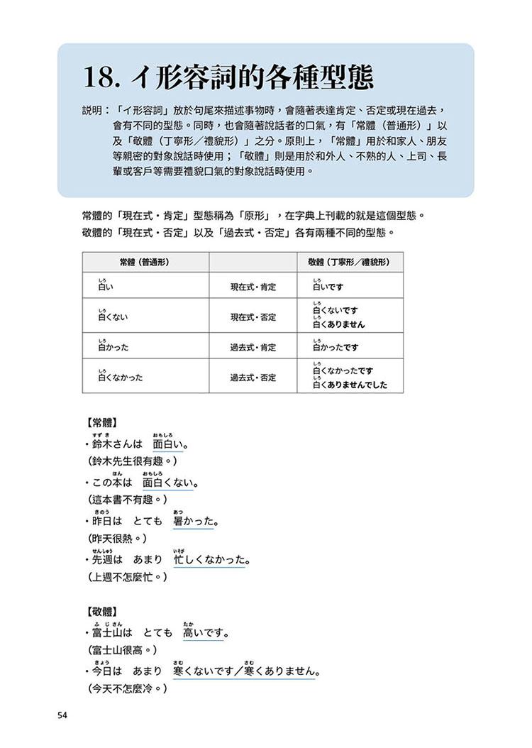 本書適合已熟悉日語平假名、片假名,且稍微學習過日語入門前幾堂課程的讀者閱讀。編排依照難易度,由淺入深、輔以實用對話、由淺入深詳細解析,例句皆附中譯、標註假名!