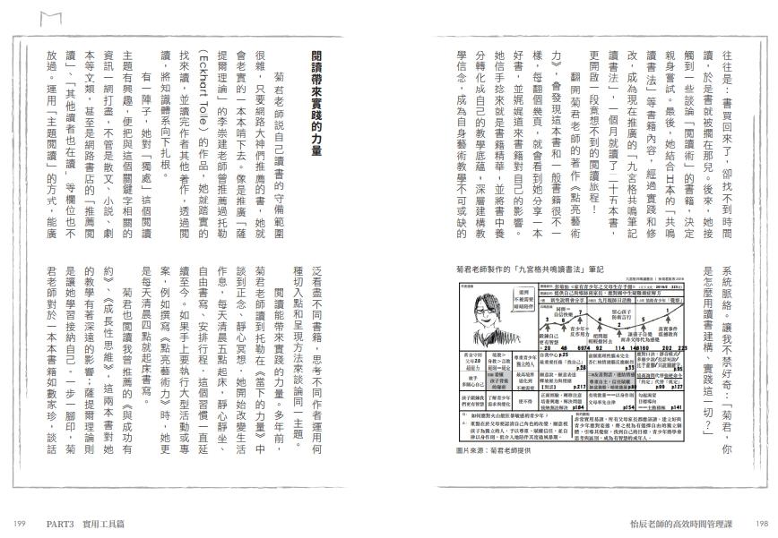 當然,怡辰老師一貫以來溫暖的筆觸,從我在閱讀她的第一本書《從讀到寫》時就感受到了。之後在《小學生年度學習行事曆》中,展現了對家長及老師們的關懷。到了這本時間管理書,則更無私的分享她的生活祕訣,每每在我閱讀時,感覺就像在聽怡辰老師講話時一樣的溫柔,讀起來很舒服、很輕鬆、又很自在。