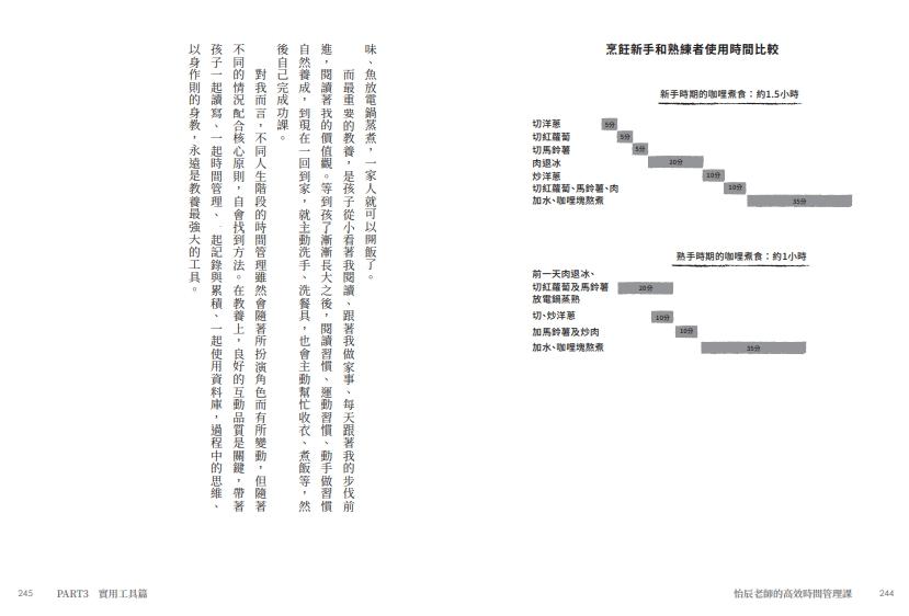 當孩子年幼時,父母真的需要花費許多時間陪伴,甚至會犧牲自己的睡眠。但孩子漸漸成長之後,就會有愈來愈多時間可以運用。像是我回家之後,要煮晚餐、看功課、閱讀、和孩子相處、做家事等。孩子回家之後,要洗手、洗餐具、吃點心、做家事、運動、寫作業、洗澡、吃晚餐、閱讀等。