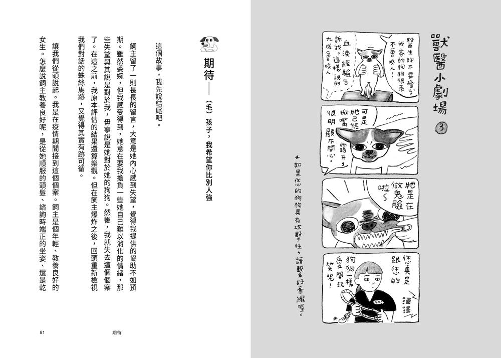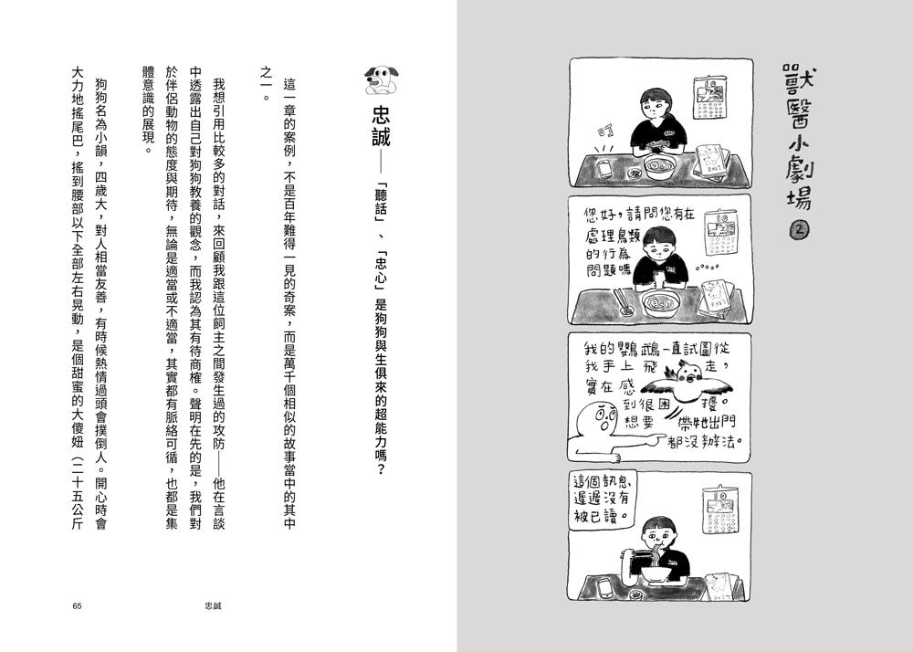 近年來,狗貓在我們的生活中不再只是所謂的家畜,而是伴侶動物(companion animal)及家人。因此衍生出對於動物行為所產生的好奇,甚至想知道牠們的想法,想知道牠們對於我們的想法,也讓動物行為專家,寵物訓練師,甚至是寵物溝通師成為當下最夯的行業。行為獸醫師(Veterinary Behaviorist)可能是一個很陌生的名詞,而到底是什麼樣的臨床獸醫工作可以變成一本不像教科書也不像工具書的書呢?