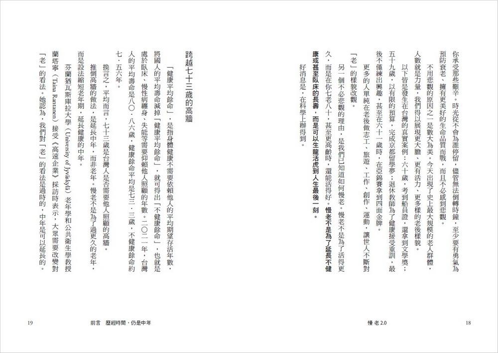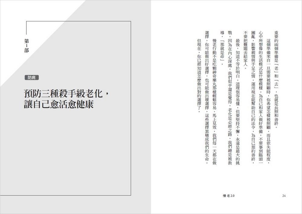 相信《慢老2.0》又將引起新一波對老化議題的重視,研讀這本書可以讓你迅速和所有研究老化的專家在思考上處於同一個書頁上(on the same page),不管你目前在人生的哪一個階段,這是一個無法逃避的議題。