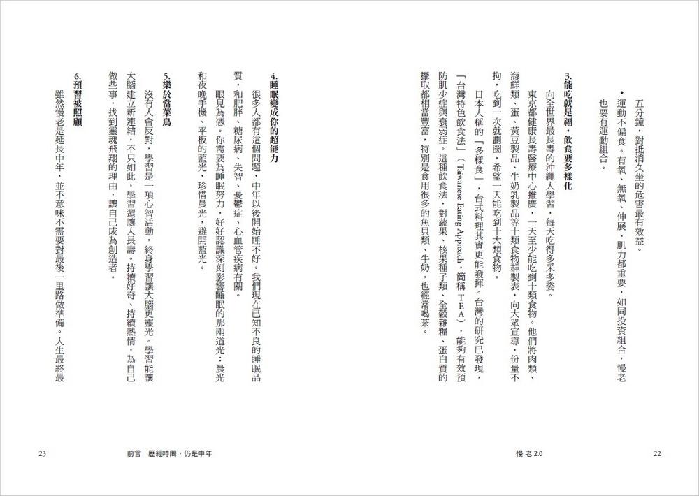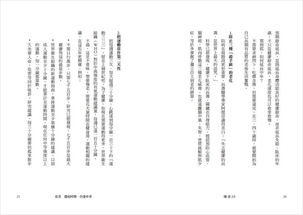 此外,這本書提及老化心態的議題,一個人的老化始於不再學習,有些人六十不到,手機就安裝倒數計時器,算數著自己還有幾天可以退休;然而,有些人到了九十歲,仍盤算著要搬家到自己夢想的地方。為了避免老化,《慢老2.0》建議養成終生學習的習慣,提供大腦保持年輕的十個好點子;五十歲之後,每個月做一件新鮮事;不要離群索居,三五好友常常湊熱鬧、串門子等,反而是長壽、降低孤獨感、減少憂鬱症的關鍵。