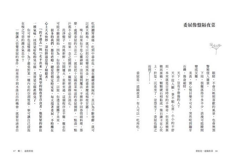 《委屈是一道隔夜菜》看著看著也從中看到愛倫姐走過的歲月,慢慢學得在人生中波瀾不驚的好性格如何修養,轉念及自在的能力如何養成,每個時刻都是學習,每篇文章都是能量。