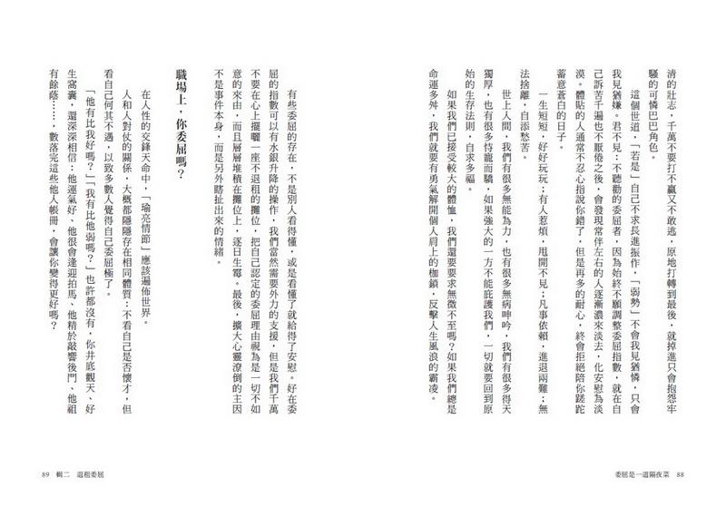 於是,選擇把委屈變成隔夜菜、選擇割除各種負面毒瘤、選擇坦然、選擇迎風微笑……選擇放過自己……,但真正教會讀者「做好」選擇的是愛倫姐那一身「傲骨」——那一身「我就是要活得好好,好好活著」的傲骨。不客套、不矯情,被她領著直觀自我。