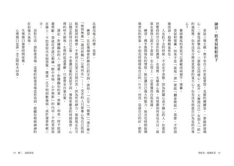 練習,忘記幾個會折磨自己的字詞,諸如:「公平」「報應」「憑什麼」「無情無義」「過河拆橋」「公理何在」……,受苦的人只要專心為自己找到脫苦脫困的機會,不要仰天長望又自問自答,因為所有神力,都展現在你可以穩定對待自己之後。不要讓氾濫的委屈字詞,導致更嚴重的情緒傷害,心理的呼天搶地,生理的低迷萎靡,只會帶來自暴自棄。
