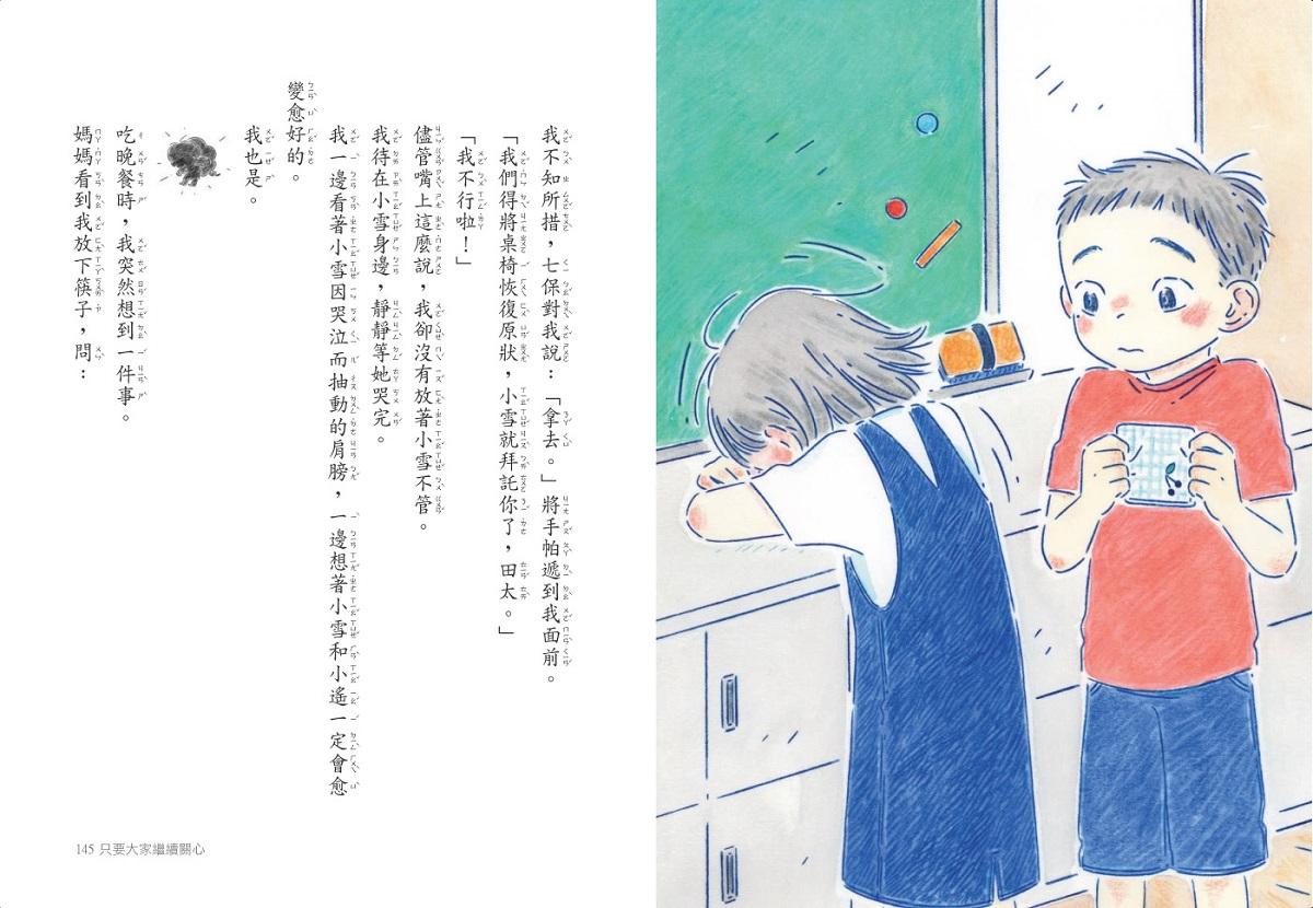 小雪想了想說:「因為圖鑑的主題必須明天交出來,但我們兩個今晚都要補英文,沒辦法想。雖然莉奈老師脾氣很好,臉上總是笑咪咪的,但要是我們明天交不出主題,她一定會生氣。你自己都說,孝四郎這傢只會滿口不在乎的說『不行啦』、『我不會』,我和七保又很忙,如果想得出來,剛剛在課堂上早就想出來了。對吧?所以這樣算一算,只剩下田太你了。田太,你可別像孝四郎那樣不負責任喔!拜託你了,加油。」小雪劈里啪啦的說完一長串的話。