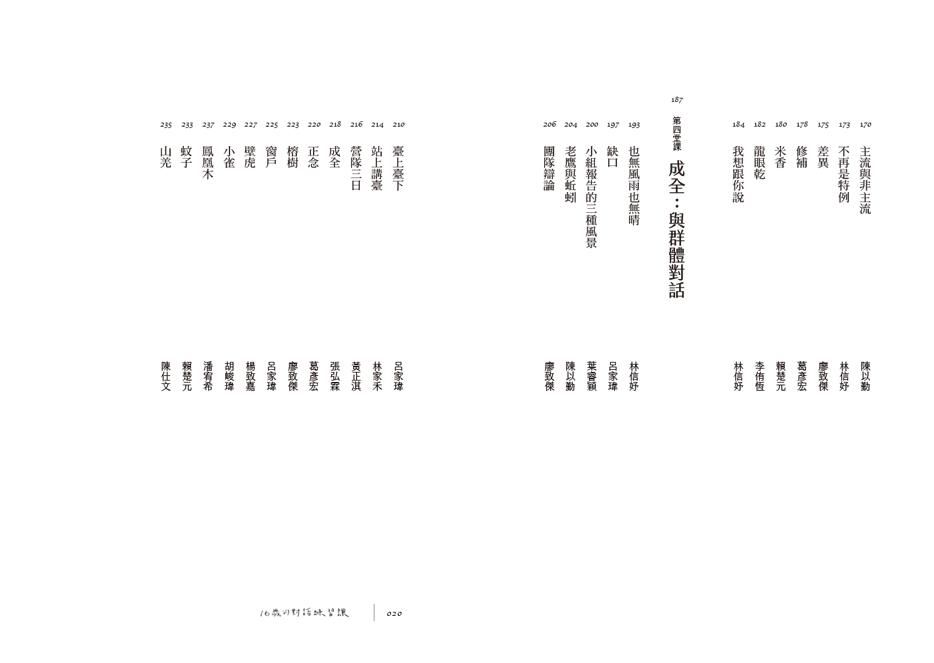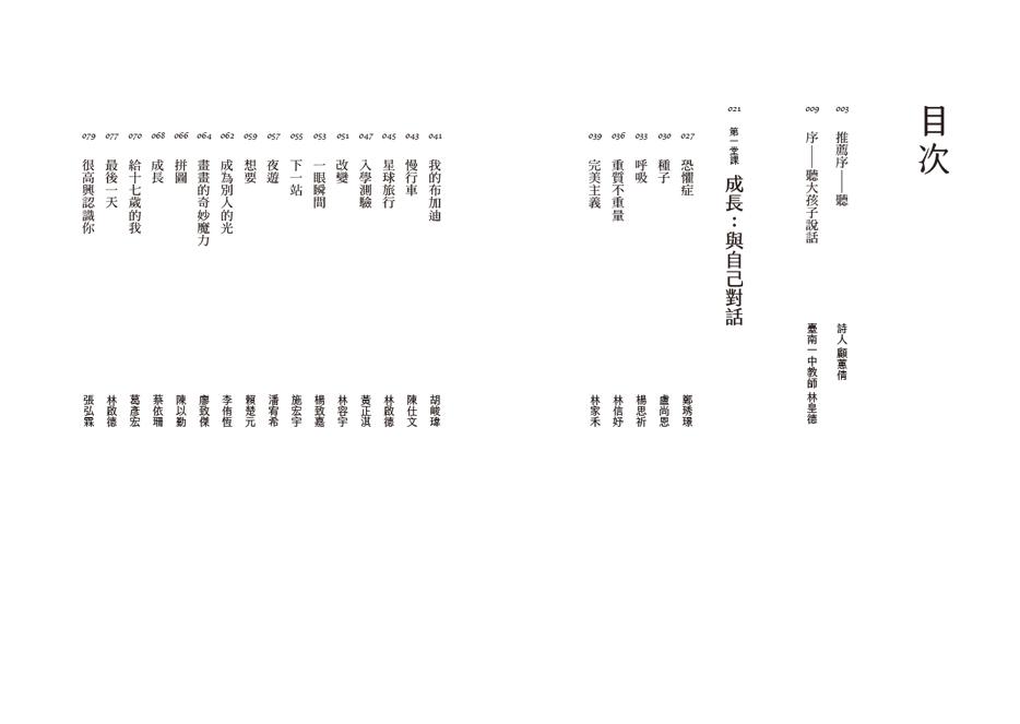 在這一系列「16歲的對話練習課」裡,有時師生席地而坐,一起沉思、討論;有時走到教室外漂流與漫步;有時天清氣朗,藍天白雲,有時颱風過後,陰雨綿綿。透過閱讀、思考、感受與書寫,對於「我是誰?」這個古老的問題,這一群青春的靈魂已經有能力更深入、更細微地思考:在自己眼中我是誰?在別人眼中我是誰?在團體裡我是誰?我眼中的世界又是什麼樣子?