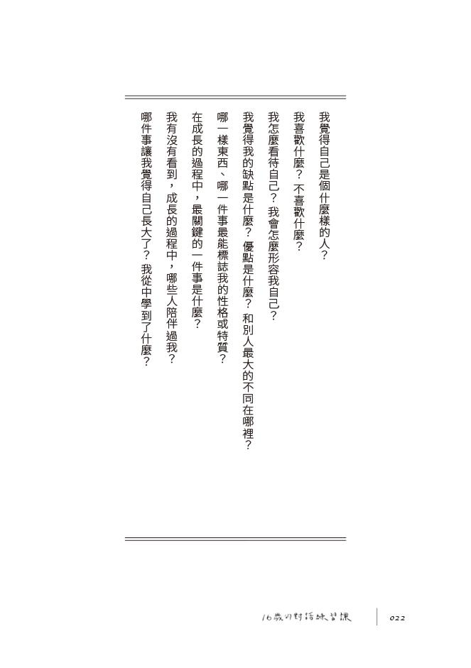 或許答案不會太容易,或許練習還要持續下去,16歲、20歲、30歲……16歲的對話練習,不只為了16歲,也不止於16歲,以傾聽與對話真誠面對自己,面對身邊每一個人,往後的年歲天天都應如此。
